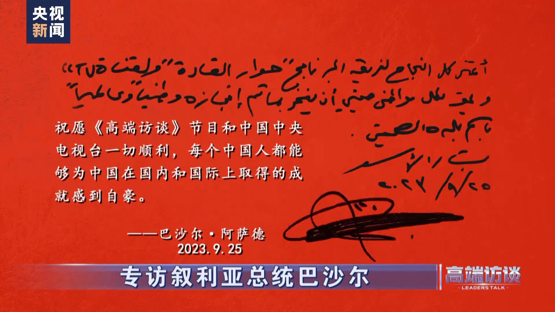 敘利亞總統巴沙爾在接受總台專訪後題詞:祝願《高端訪談》節目和中國中央電視台一切順利,每個中國人都能夠為中國在國內和國際上取得的成就感到自豪!