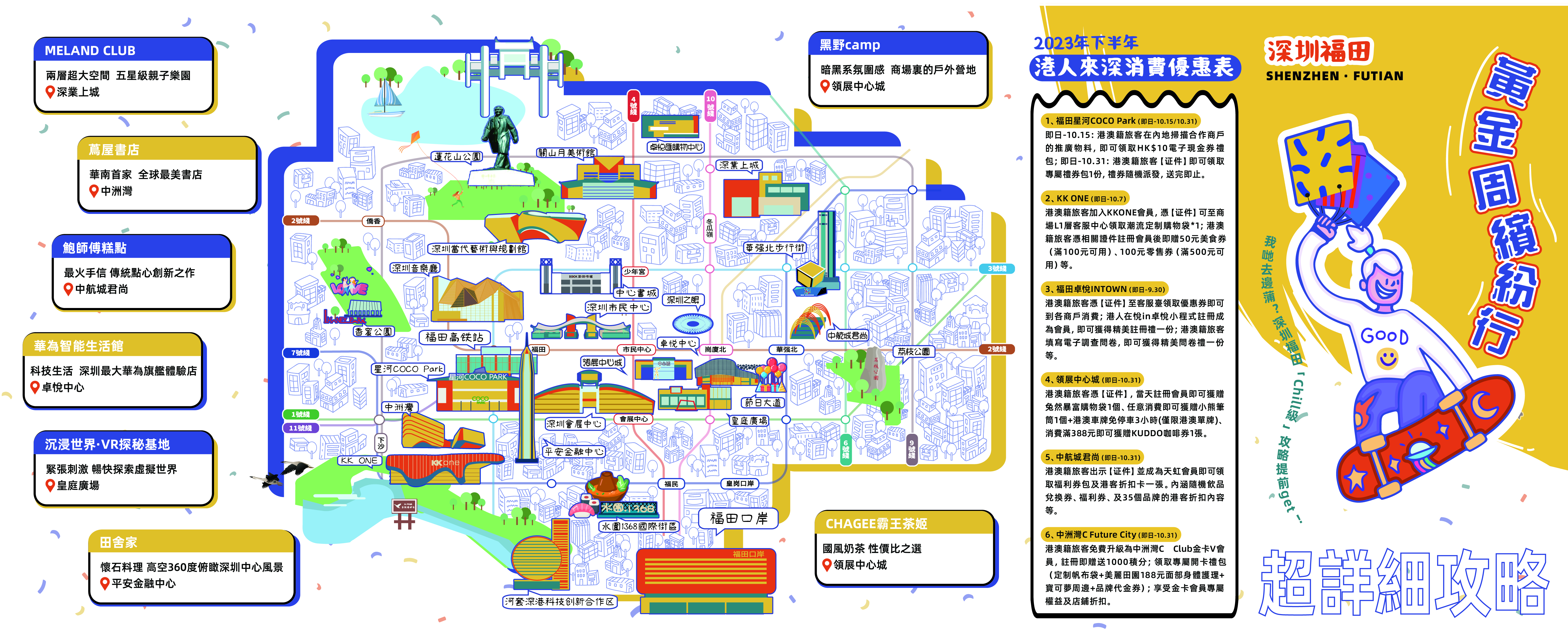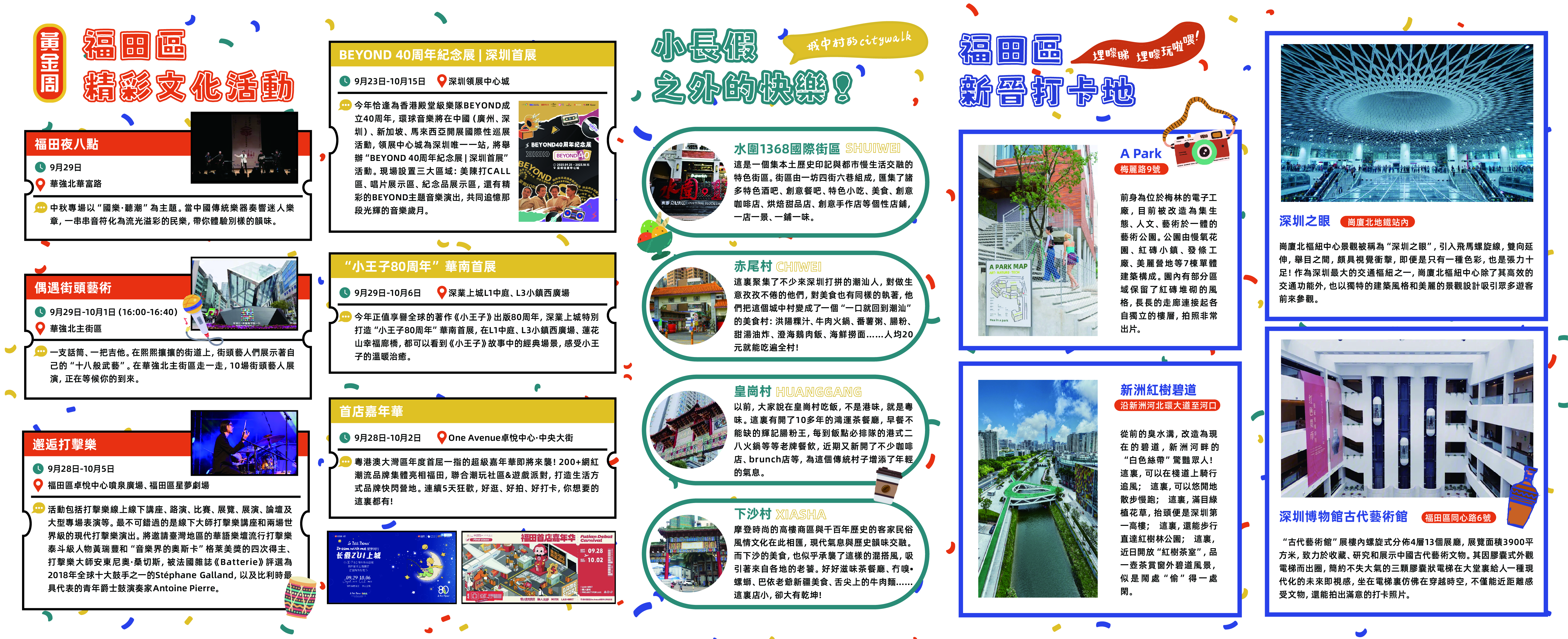 (大公文匯網記者胡永愛)今年中秋、國慶假期已經開啟,深港換城旅行正火熱。從福田口岸過關後,應該去哪玩、商場有優惠、有什麼新興打卡地,是很多港人的疑問。近日,深圳福田區推出《深圳福田·黃金周繽紛行》小冊子,於福田口岸、福田高鐵站、羅湖口岸出口處進行派發。小冊子中不僅羅列了最近福田區各大商場的熱門商家、港人的專屬優惠折扣,還有假期期間港人可參與的各類文化活動,以及適合年輕人的福田區新晉熱門打卡地等內容。