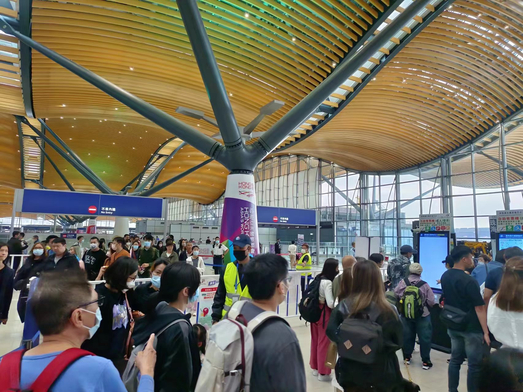 今日上午10時起,港珠澳大橋香港口岸出入境的人流增加。約上午11時,過關人龍排至門外並「打蛇餅」,現場實施人流管制,有告示牌提醒,輪候金巴時間約為30分鐘或以上。至中午時分,離境大堂貼出告示指,金巴輪候時間為60分鐘。