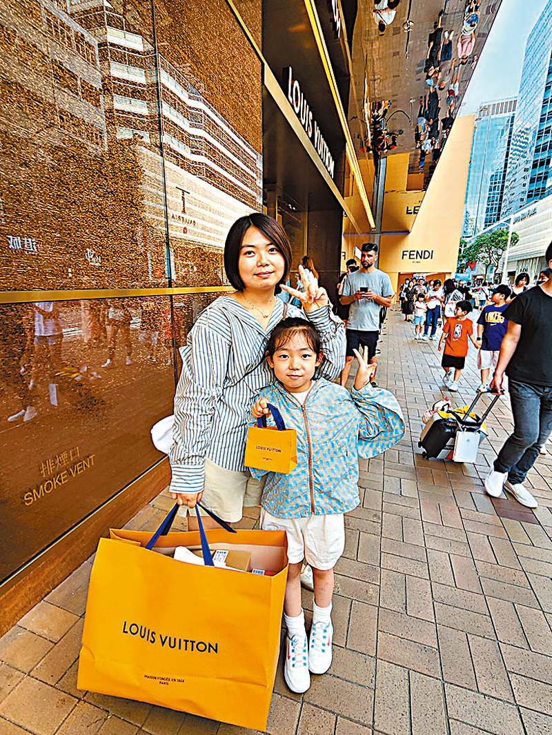 記者碰見提着「戰利品」步出名店的汪女士一家三口,她們來自江蘇,計劃在港逗留數天,並專程到尖沙咀血拚。「已經花了5萬塊買包包,有些款式是香港獨有的,香港通常會推出好多新款,買得好爽!」汪女士興奮地說,雖然港元匯價轉強,但與人民幣仍存在匯率差價,加上香港奢侈品定價比內地低兩三千元,感覺香港的商品比較實惠,預計會花費最少十萬元購物。
