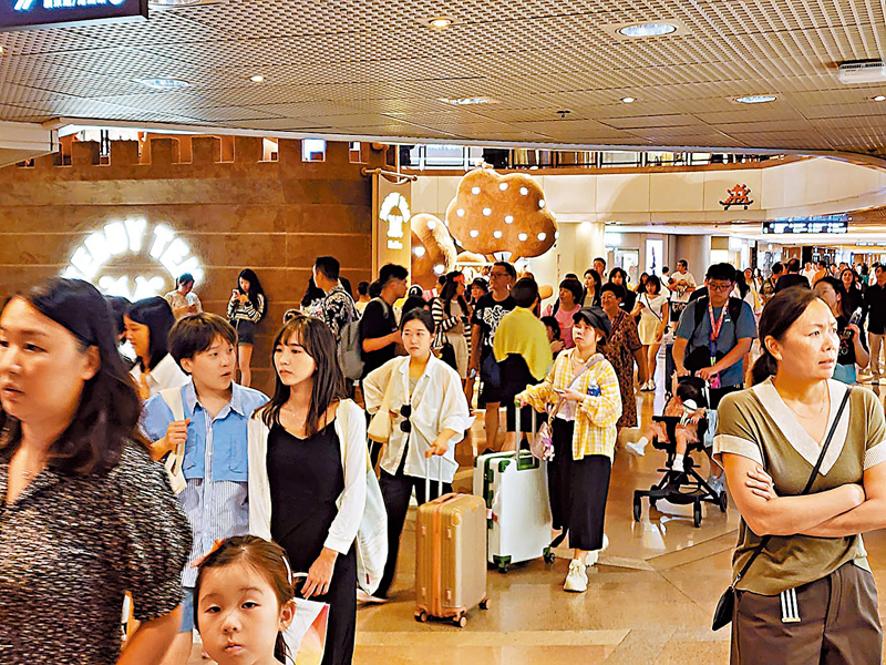 香港文匯報記者又發現不少旅客拖着行李箱在商場內購物,亦有數十位旅客在名牌皮革店外排隊輪候入場,準備搶購最新款商品,現場人聲鼎沸,非常熱鬧。