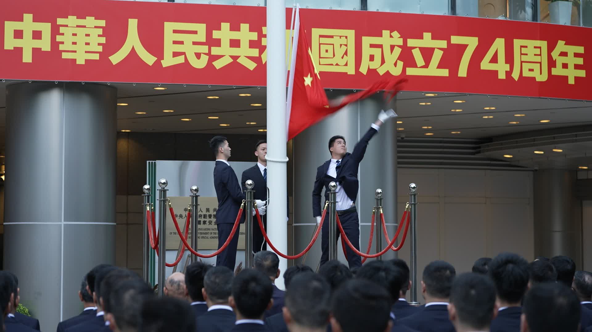 10月1日,中央人民政府駐香港特別行政區維護國家安全公署舉行升國旗儀式,慶祝中華人民共和國成立74周年。