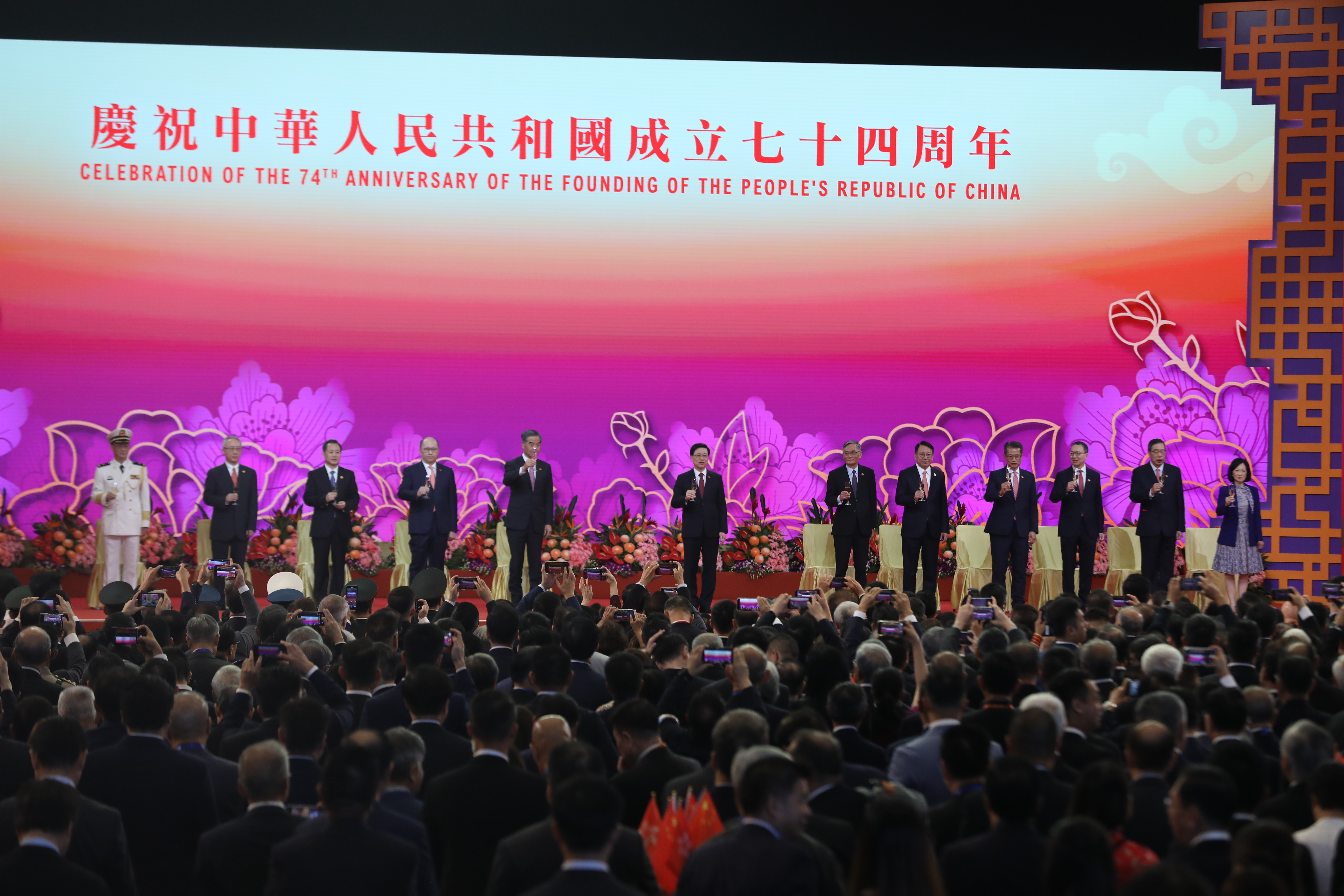 (大公文匯全媒體記者 李九歌、王俊傑)今日(10月1日)是中華人民共和國成立74周年國慶日,香港特區政府今早在灣仔金紫荊廣場舉行升旗儀式。升旗儀式結束後,特區政府在會展中心舉行國慶酒會,行政長官李家超主禮,表達對祖國的祝福。