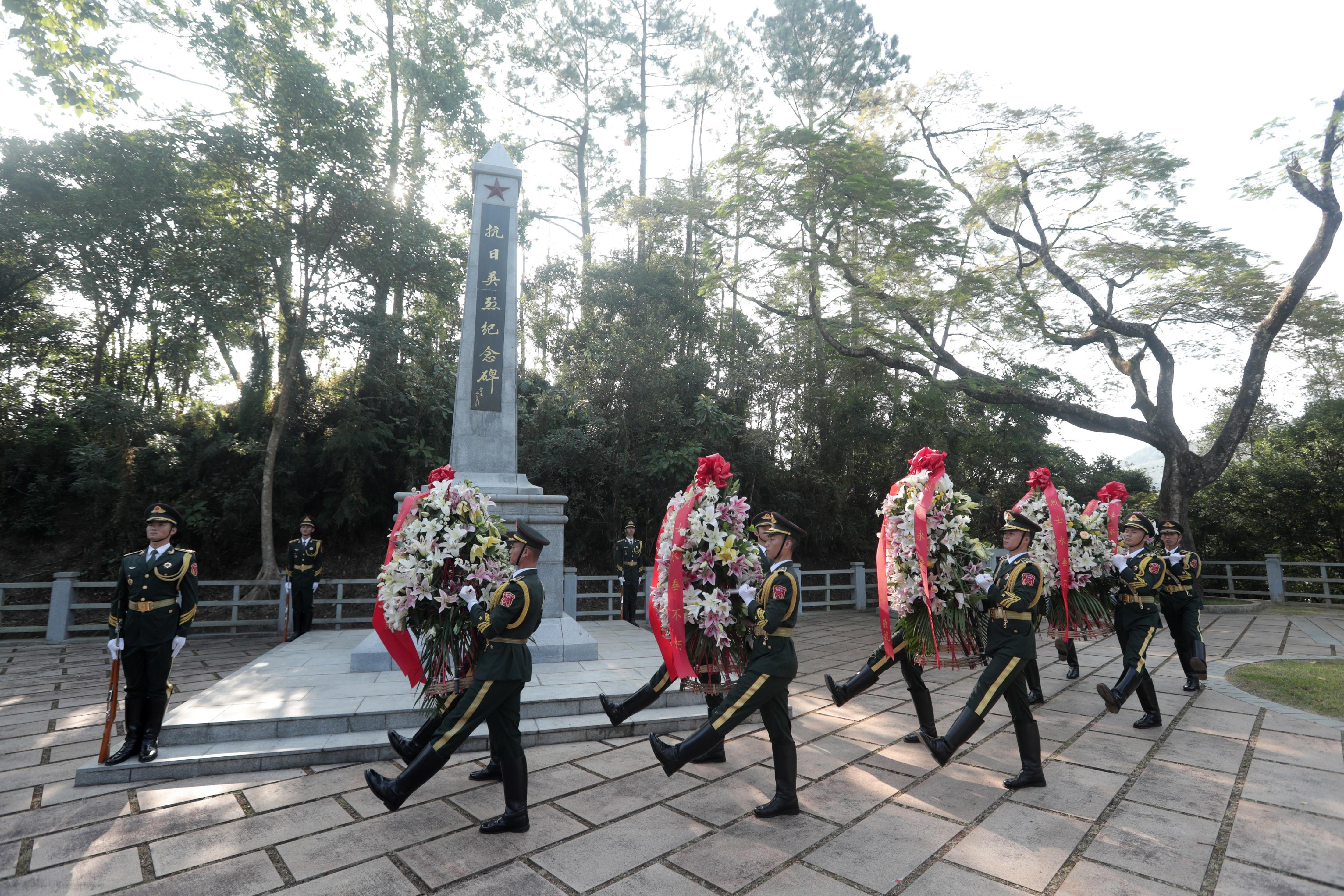 敬獻花籃儀式中,參加活動的駐香港部隊官兵代表、原東江縱隊港九大隊老戰士代表和香港中小學師生代表等莊嚴肅立列隊。駐香港部隊儀仗禮兵邁着威武莊重的步伐就位,全場高唱國歌,然後集體默哀、敬讀碑文、敬獻花籃。