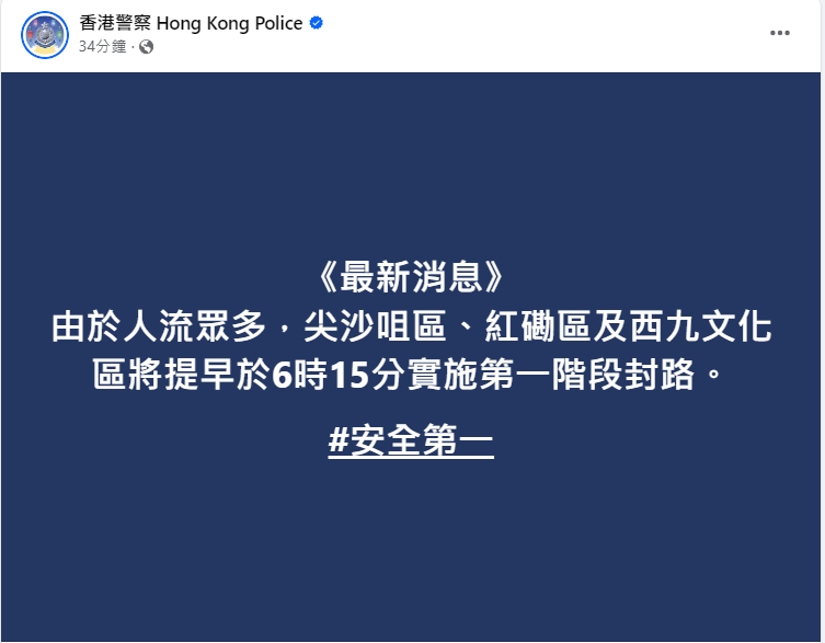 大公文匯全媒體報道,時隔5年復辦的十一國慶煙花匯演將於今晚(10月1日)9時在維港上演,不少市民已一早到達尖沙咀海傍一帶。警方原定晚上7時起於九龍區分三階段封路,惟警方今日下午近6點在社交平台宣布,由於人流眾多,尖沙咀區、紅磡區及西九文化區將提早於6時15分實施第一階段封路。
