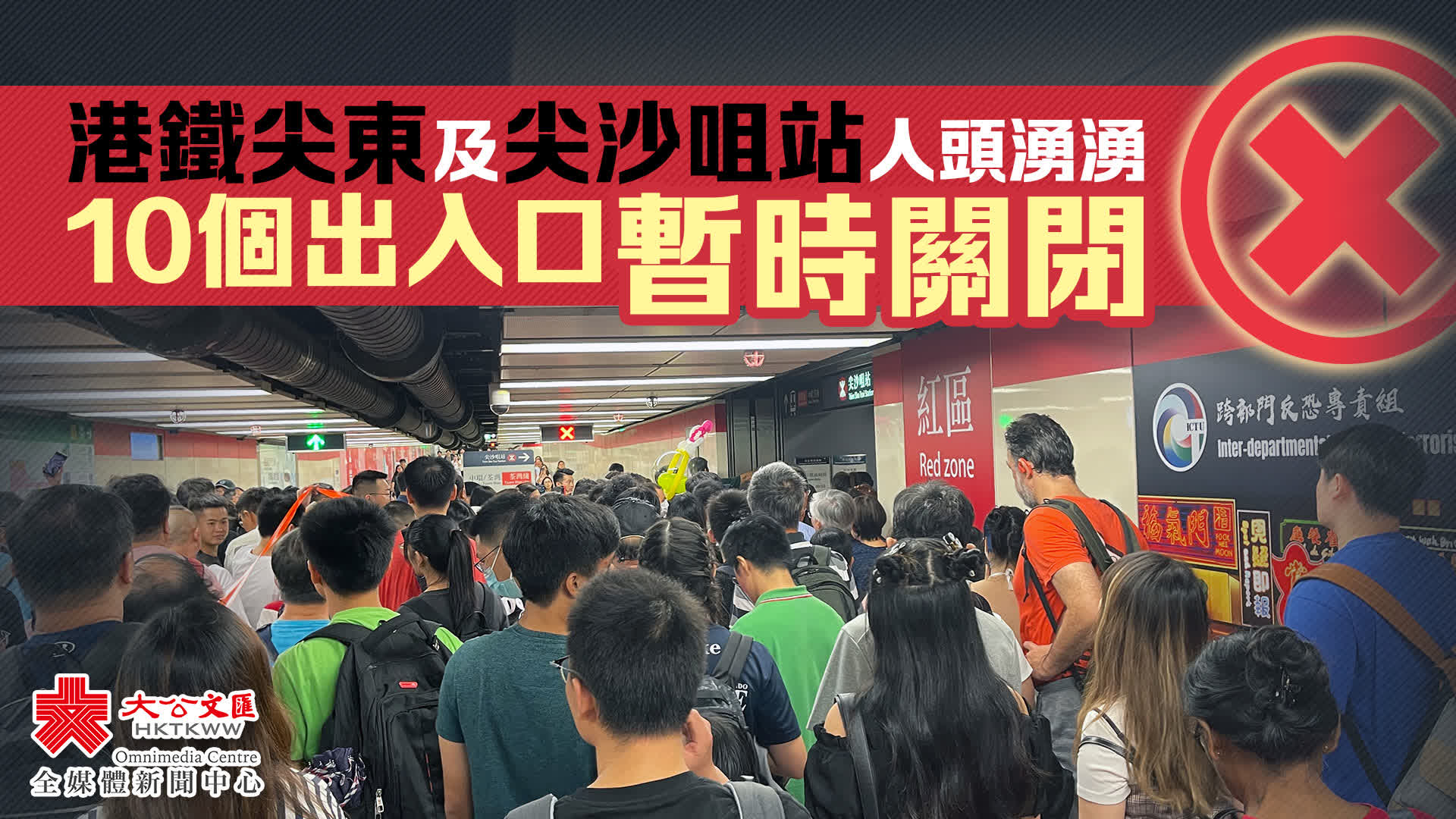 港鐵表示,因應警方於路面實施人潮管制,暫時關閉尖東站 J、K、L1、L4、L5、L6、N3 及 P3 出入口,以及尖沙咀站 H 及 R 出入口,呼籲乘客使用其他出入口。