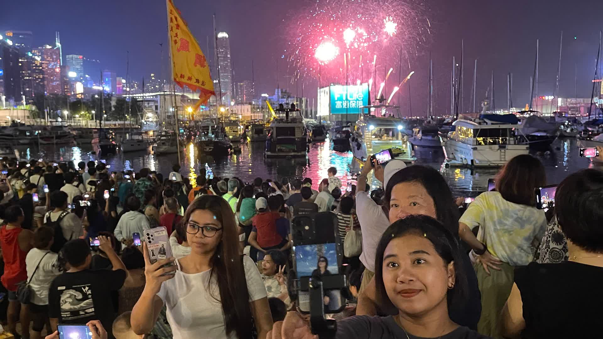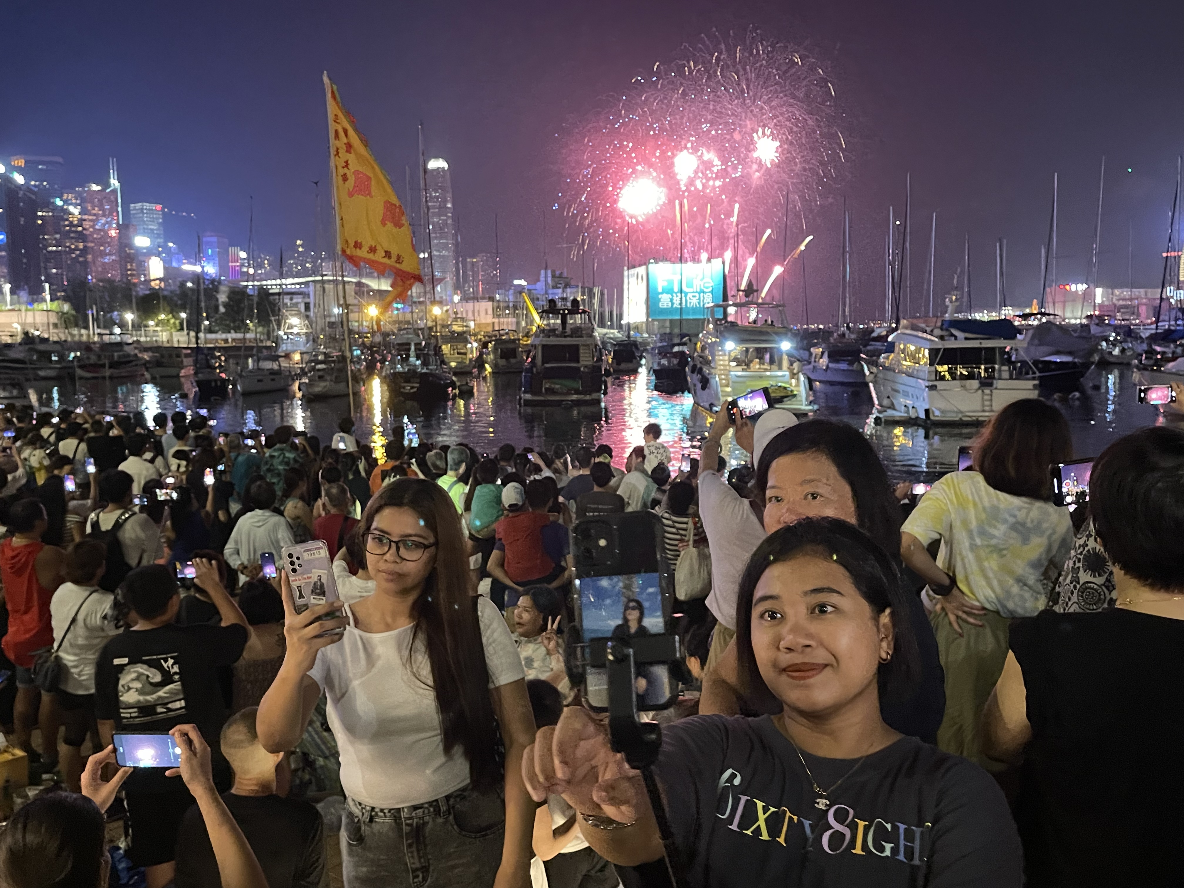 大公文匯全媒體報道,國慶煙花今晚(10月1日)在維港上空綻放,大批市民在維港兩岸觀賞。到9時半,煙花匯演完滿結束,人潮散場,警方已於多處人群聚集的地方,包括尖沙咀海傍一帶、西九文化區、灣仔及中區海傍等地區分階段實施相應人潮管制措施。會展站人頭湧湧,市民及遊客有序搭乘港鐵離開;另一邊尖沙咀麼的道人潮有序退場,未有見到阻滯。