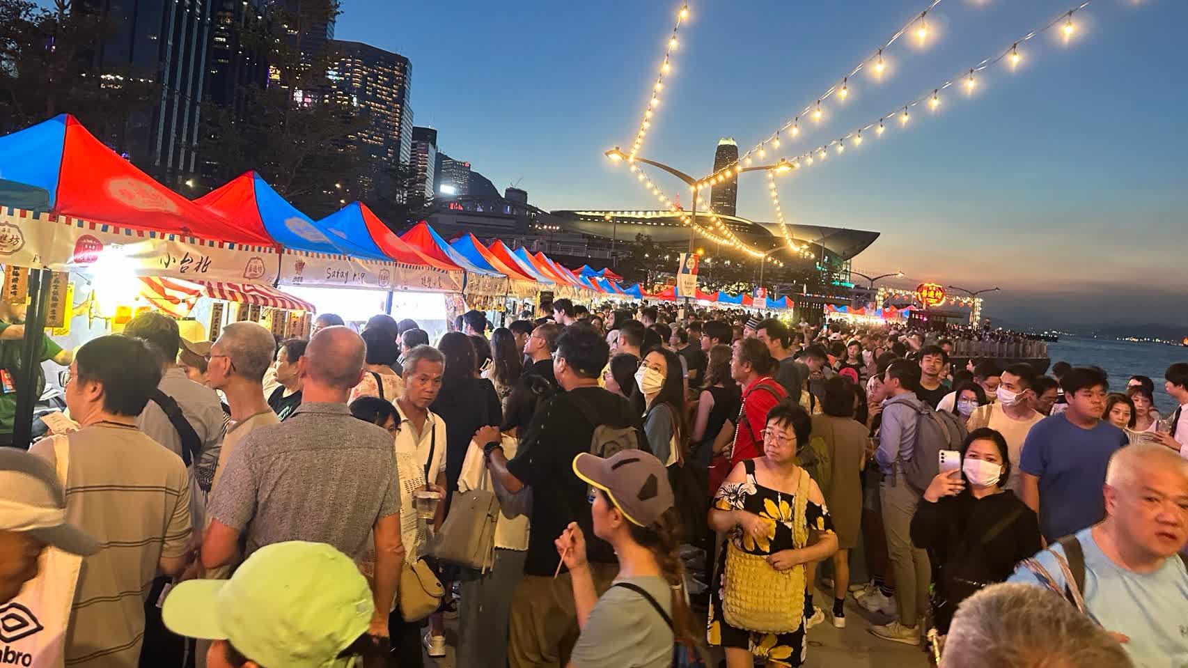 大公文匯全媒體報道,十一國慶煙花暌違5年今晚(10月1日)於維港上空再度上演,超過43萬人次在維港兩岸觀賞煙花。煙花匯演於晚上9時半結束,原定今晚10時半重開的灣仔「海濱藝遊坊」市集提早至晚上9時45分重啟,人流絡繹不絕。