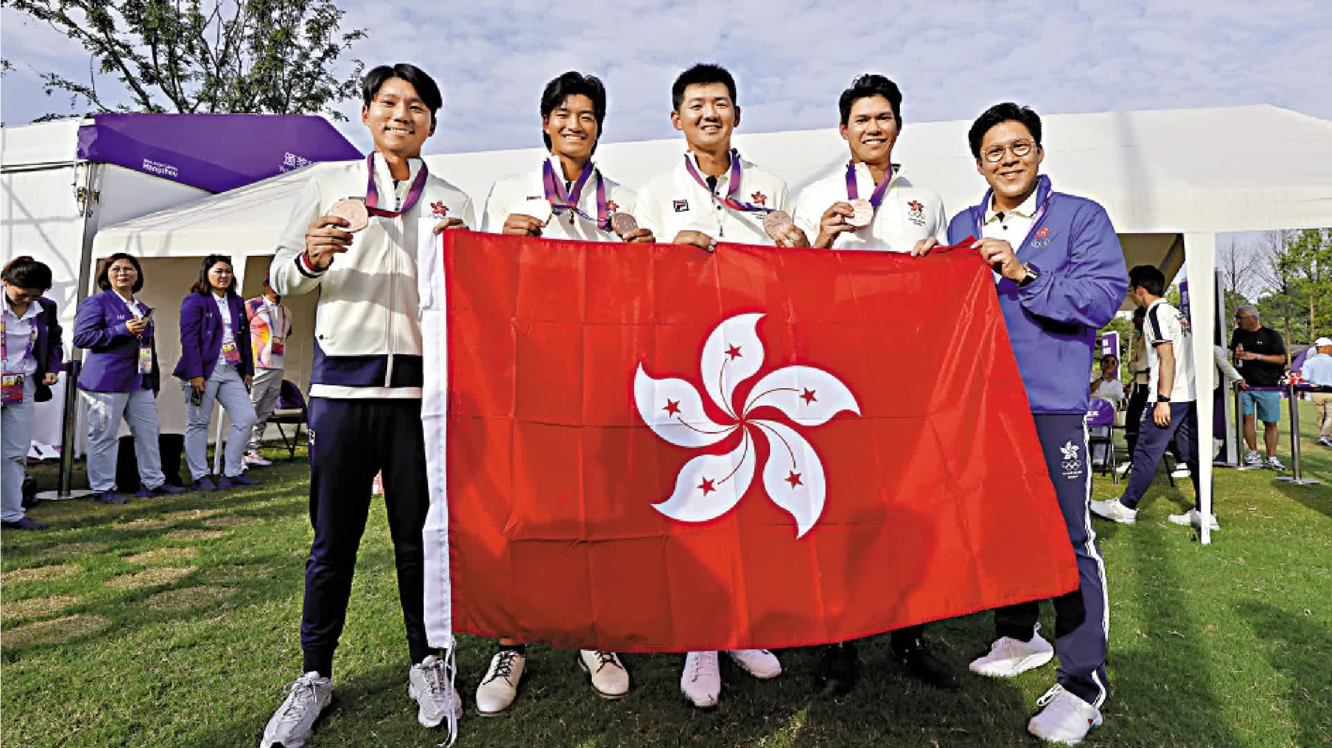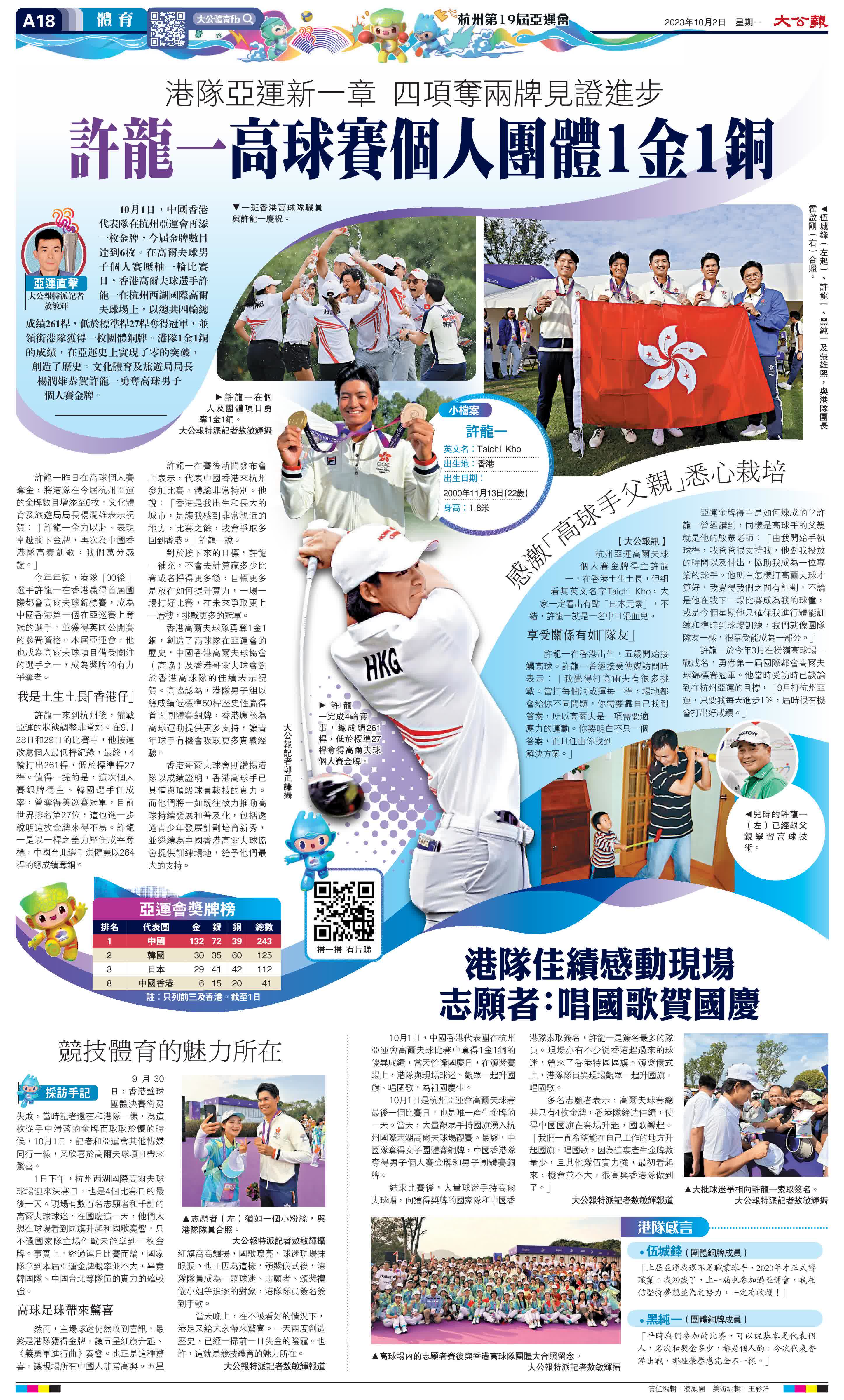 (大公報特派記者 敖敏輝)10月1日,中國香港代表隊在杭州亞運會再添一枚金牌,今屆金牌數目達到6枚。在高爾夫球男子個人賽壓軸一輪比賽日,香港高爾夫球選手許龍一在杭州西湖國際高爾夫球場上,以總共四輪總成績261桿,低於標準桿27桿奪得冠軍,並領銜港隊獲得一枚團體銅牌。港隊1金1銅的成績,在亞運史上實現了零的突破,創造了歷史。文化體育及旅遊局局長楊潤雄恭賀許龍一勇奪高球男子個人賽金牌。