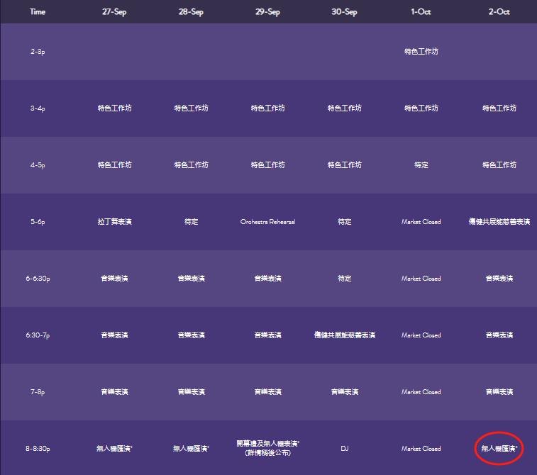 發展局9月30日在社交平台曾發文表示,按灣仔「海濱藝遊坊」節目表,9月30日及10月1日不設無人機表演,下次無人機表演將會在10月2日晚上8時重新舉行。