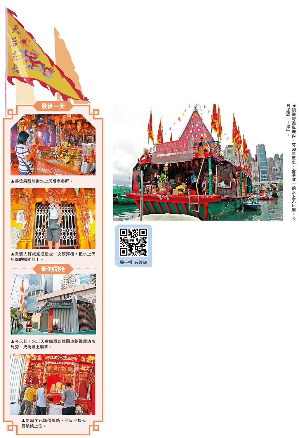 「屹立」銅鑼灣避風塘近70年、全港唯一的水上天后廟,昨日迎來最後一個「飄流」日子。今天,這家傳奇廟宇「上岸」,在銅鑼灣消防局「登陸」,方便善信參拜,更好延續天后信仰傳統。