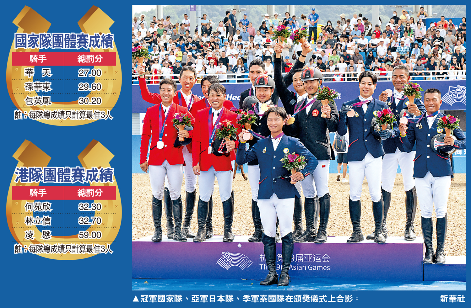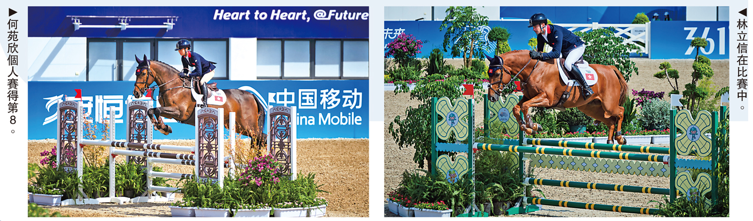 馬會馬術隊成員何苑欣(馬匹:馬會妙天)、林立信(馬匹:馬會奮進)、蘇昱軒(馬匹:Spypark Ferro XS)及凌慇(馬匹:A Sparkling Bellini),代表香港參加馬術三項賽,昨天是最後一項場地障礙賽。所有騎手需於3天賽事策騎同一馬匹;在首日盛裝舞步賽結束後,每位參賽者的分數會轉為罰分,在經過越野賽及場地障礙賽後,計算所得罰分最少者為勝。