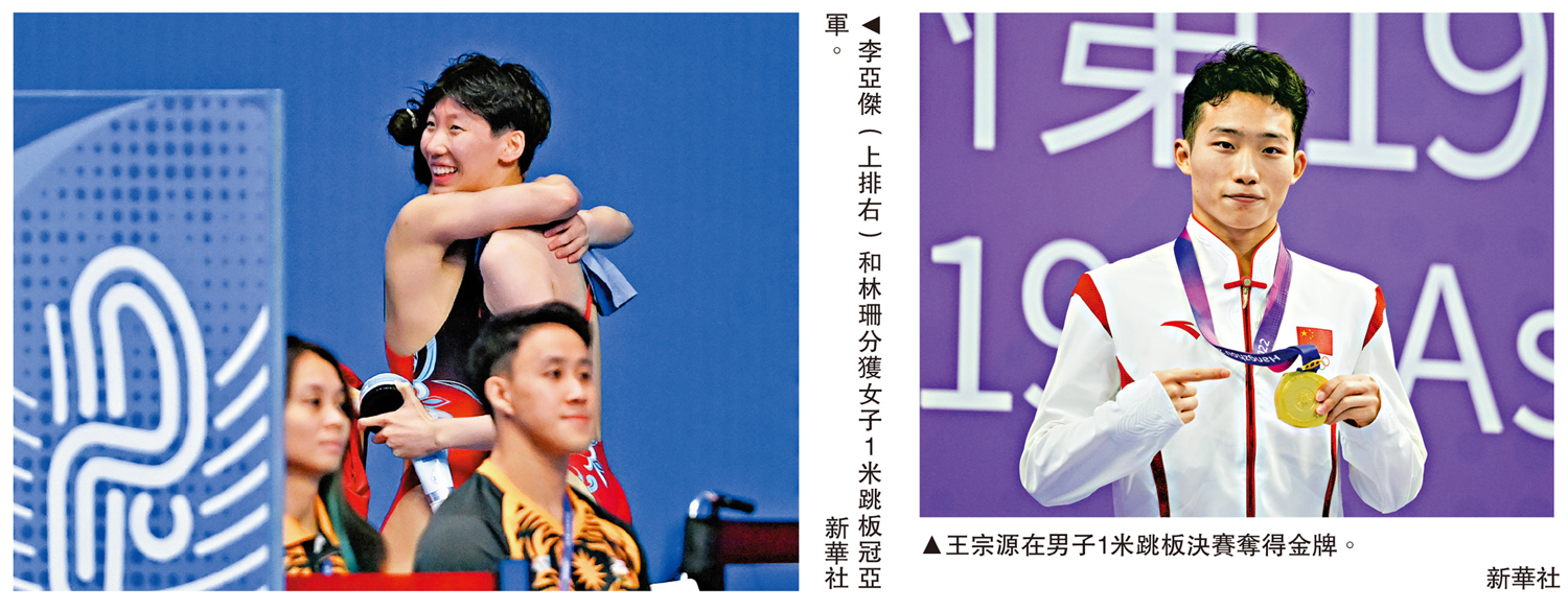 大公報報道,杭州亞運會跳水項目昨展開第3個比賽日,包括男子1米板及女子1米板決賽,有「夢之隊」之稱的國家隊,4位世界冠軍王宗源、彭健烽、李亞傑和林珊不負眾望,包攬兩個項目的金銀牌。男子1米板決賽,王宗源以總分459.50分奪金,彭健烽以442.45分奪銀;女子1米板決賽,李亞傑總分317.55分獲金牌,領先摘銀的隊友林珊13.75分。中國跳水隊目前包攬6個項目所有金牌。
