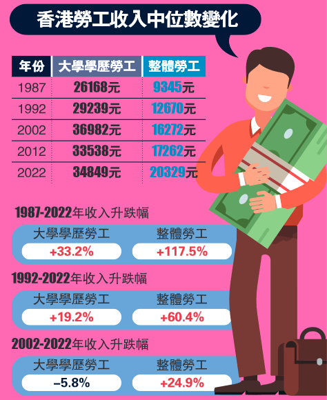 新青年論壇昨日公布《香港各世代大專生收入比較研究報告》,數據指出,目前年輕世代受教育水平普遍較高,但對教育水平有較高要求的高技能勞工崗位數量增長較慢,遠遠趕不上大學學歷勞工數量的高速增長。在2012年至2022年間,大學學歷勞工增加了9.2%,高技能勞工崗位卻只增長了4.5%,令僧多粥少情況日趨嚴重。