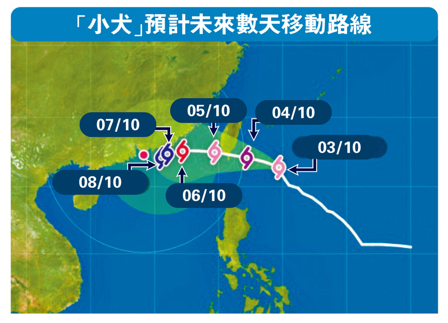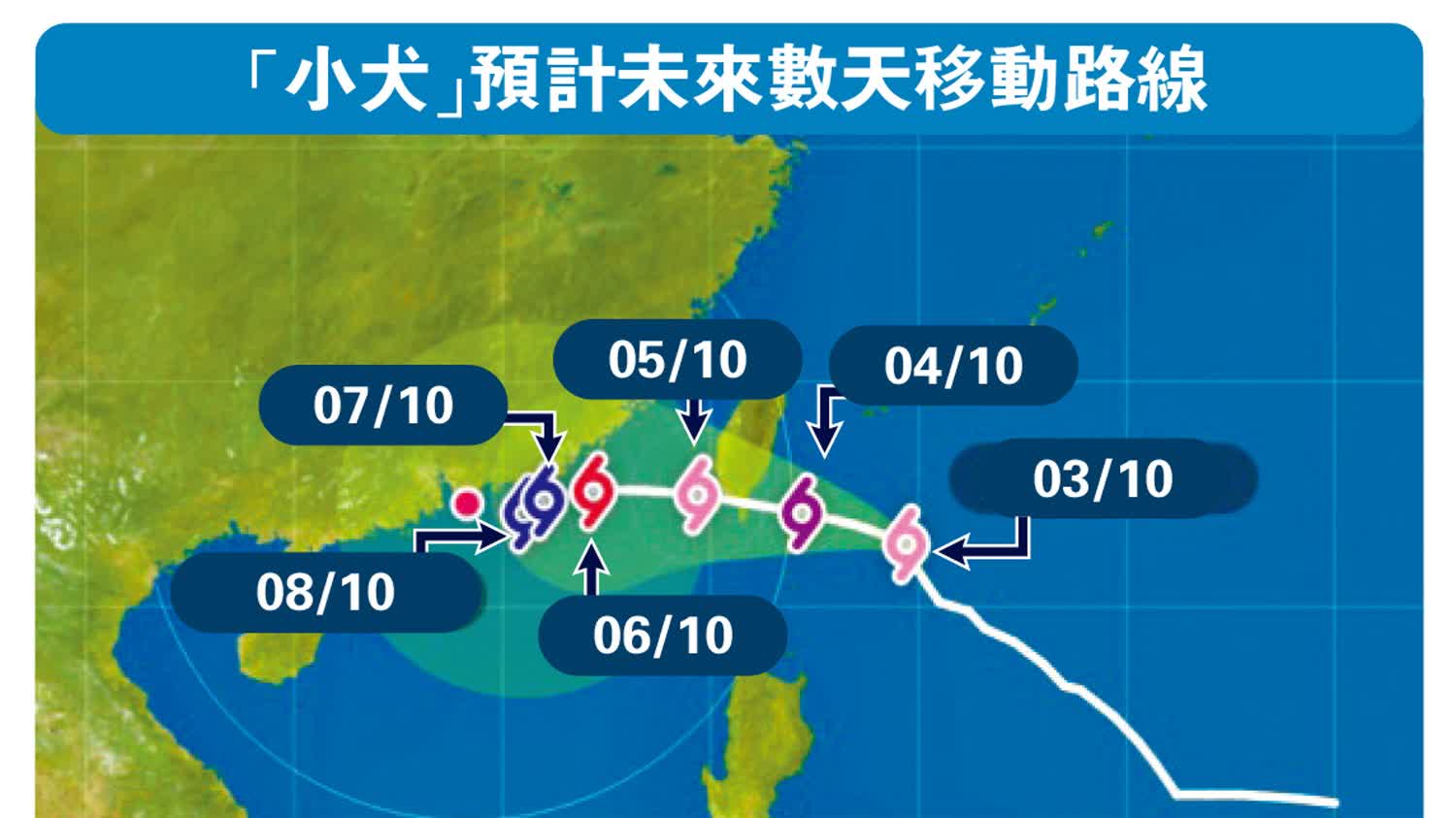 按照現時預測路徑,「小犬」今日下午將以超強颱風級別進入本港800公里範圍,但明日掠過台灣南部後,將會減弱為強颱風,周五進入本港400公里範圍,並移向廣東東部沿岸。