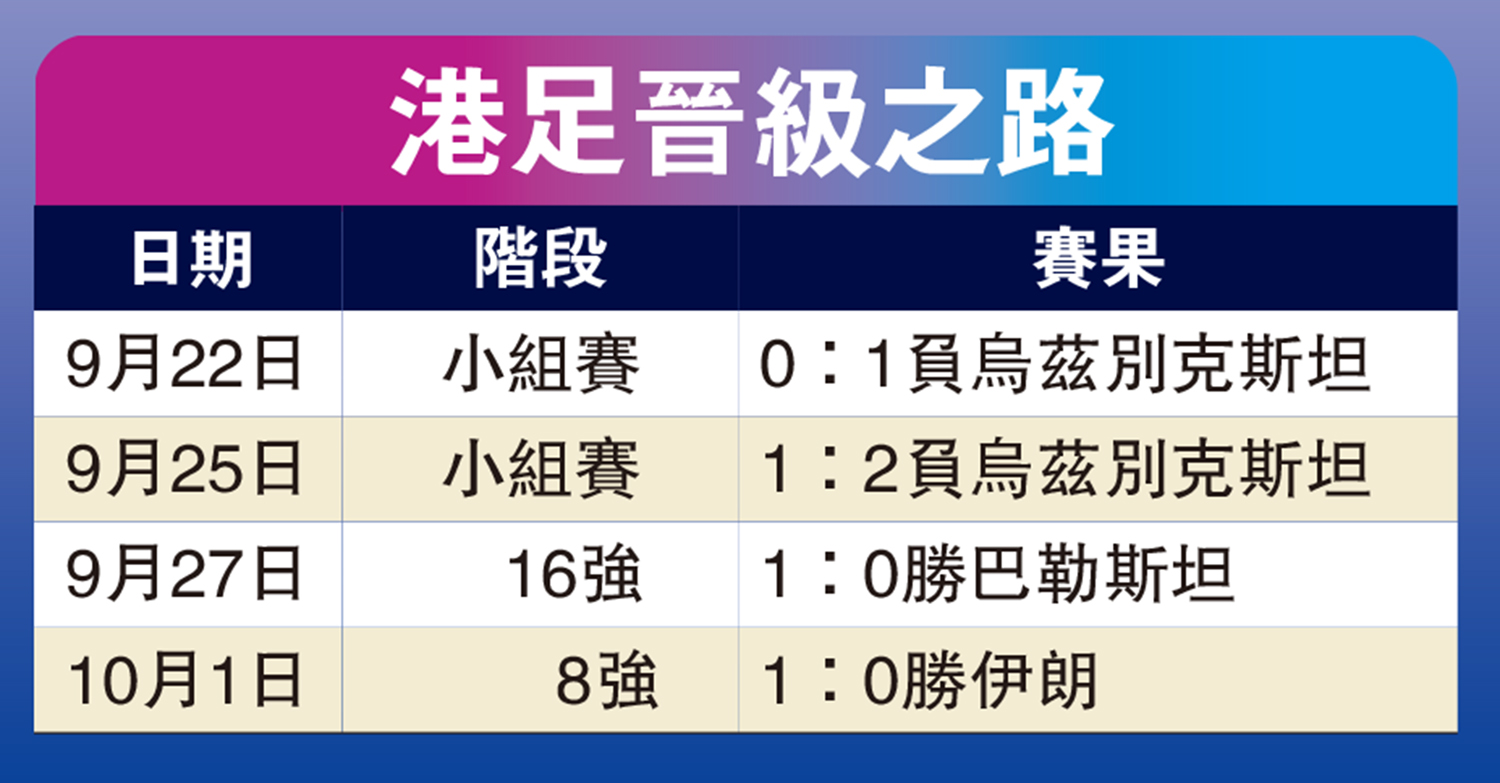 港足在本屆小組賽受惠於原本同組的敘利亞及阿富汗先後退賽而穩奪出線資格,雖然兩鬥烏茲別克斯坦都落敗,但仍能夠以小組次名晉級。16強面對在小組賽僅以0:1不敵日本的巴勒斯坦,港足憑着3名超齡球員之一的安永佳建功而躋身8強,平了球隊歷來在亞運的最佳成績,繼而更憑潘沛軒的近門妙射,「爆冷」勇挫西亞勁旅伊朗,成功突破港足在亞運的「天花板」,寫下球壇又一以弱勝強的經典之戰。
