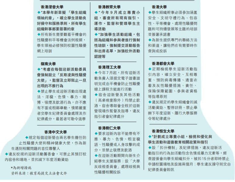 教育局提到,現時各大學的學生事務處 /學生宿舍處均有學生主辦活動透過制訂指引,確保活動遵循法律及大學規例,並尊重所有參與者權利,當中列明嚴禁具冒犯性或不恰當的行為或言語、飲用含酒精飲品、於深夜時分進行活動等。部分大學亦有就迎新活動設立專責委員會,安排教職員或宿舍導師對不同學科或學生宿舍迎新活動進行規劃、協調、審批及監察等。針對活動搞手,大學亦有提供適切培訓,普遍要求他們必須出席有關誠信操守、守法意識、防止性騷擾、平等機會與共融、保護個人資料及危機應對等範疇講座和工作坊。