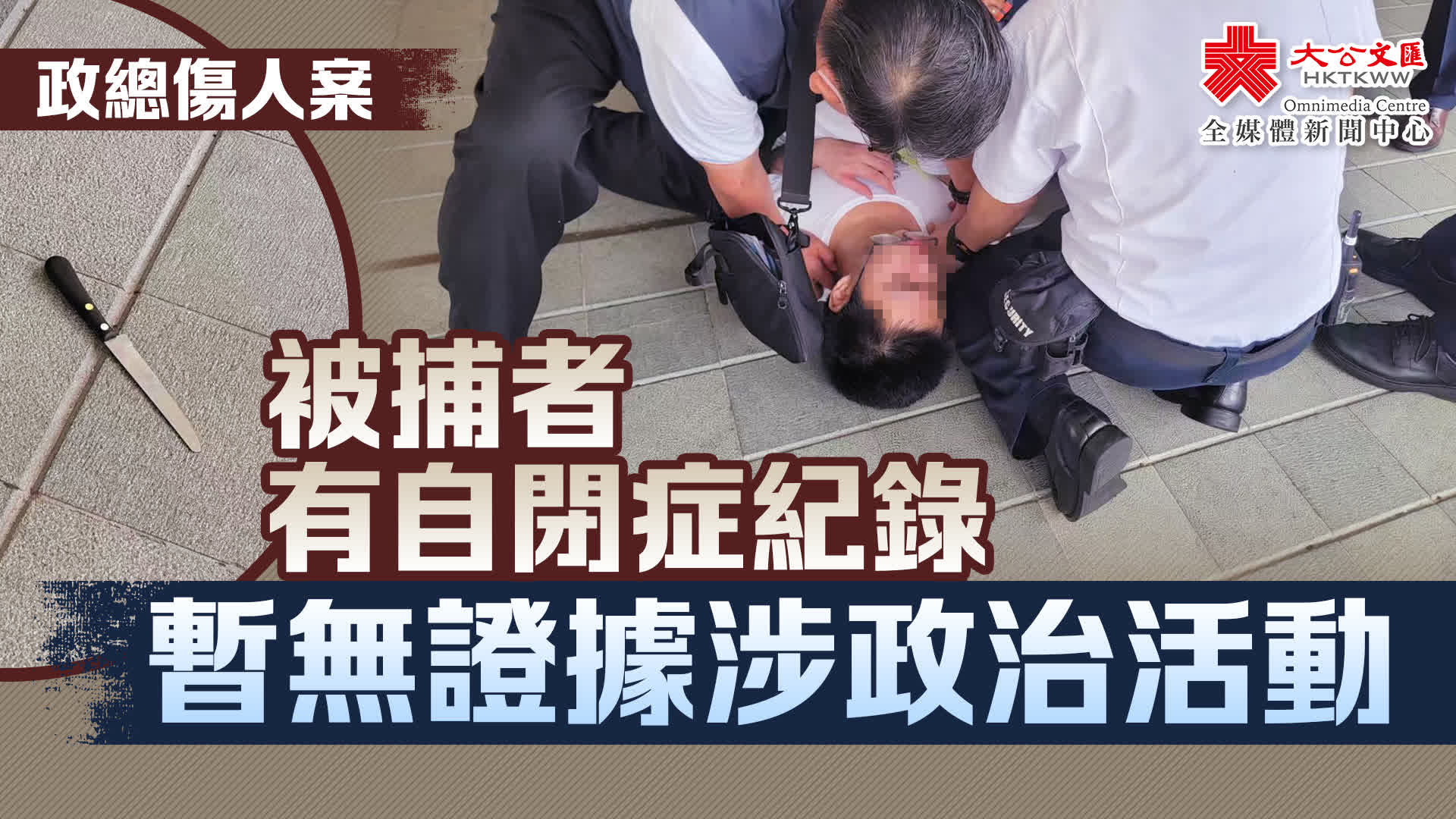 大公文匯全媒體報道,金鐘政府總部外今日(4日)發生持刀襲擊事件。上午10時15分左右,金鐘添馬添美道2號政府總部門外,一名戴眼鏡、身穿白色上衣的17歲男子持刀襲擊保安,其間企圖自殺。多名途人及保安協助制服疑兇。