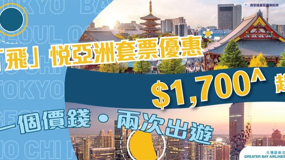 大公文匯全媒體報道,大灣區航空再推「飛悅亞洲套票」優惠,由即日起至本月31日,只須1700元起,即可購買任何2個亞洲航點的來回機票共2張。當中港人最鍾意目的地日本,兩次出遊來回機票僅3700元,不到2000蚊即可往返東京或大阪;台灣則在「最平」一檔,1700蚊玩兩次!