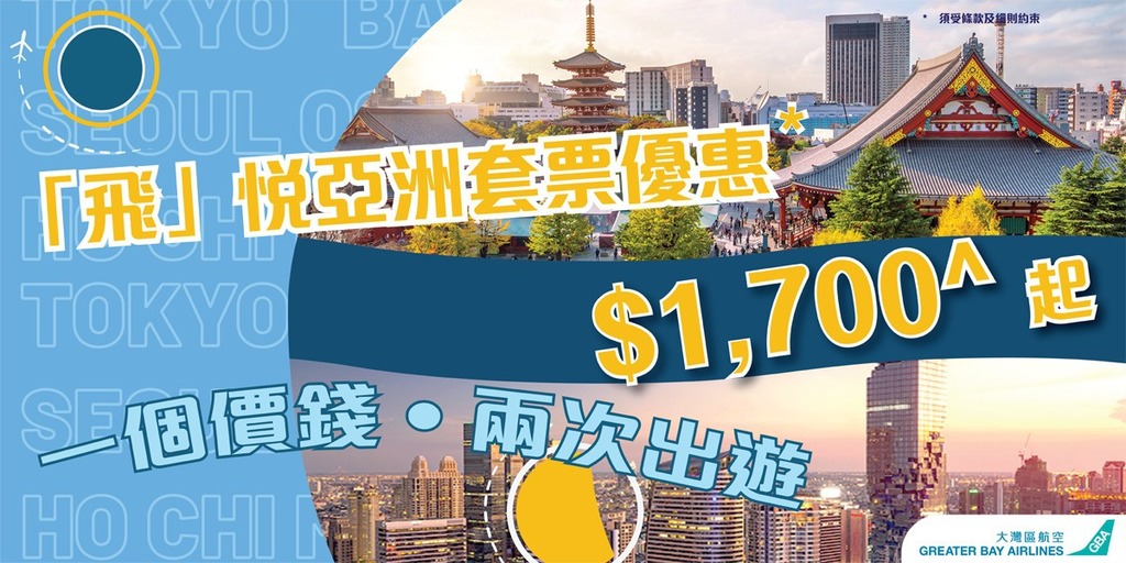 套票優惠適用於來年3月26日或之前從香港出發前往東京、大阪、首爾、台北、曼谷或胡志明市的大灣區航空航線,同時只適用於同一位乘客,每程停留日數最多為14日。首個旅程須於本年12月21日或之前出發。票價包含每程7公斤手提行李限額外,會加送20公斤託運行李限額,以滿足旅客所需。