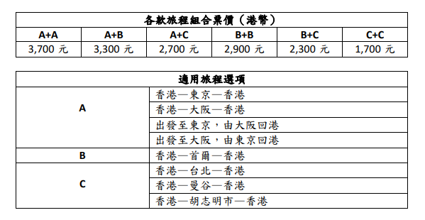 各款旅程組合票價如下(不包括相關税項及燃油附加費):