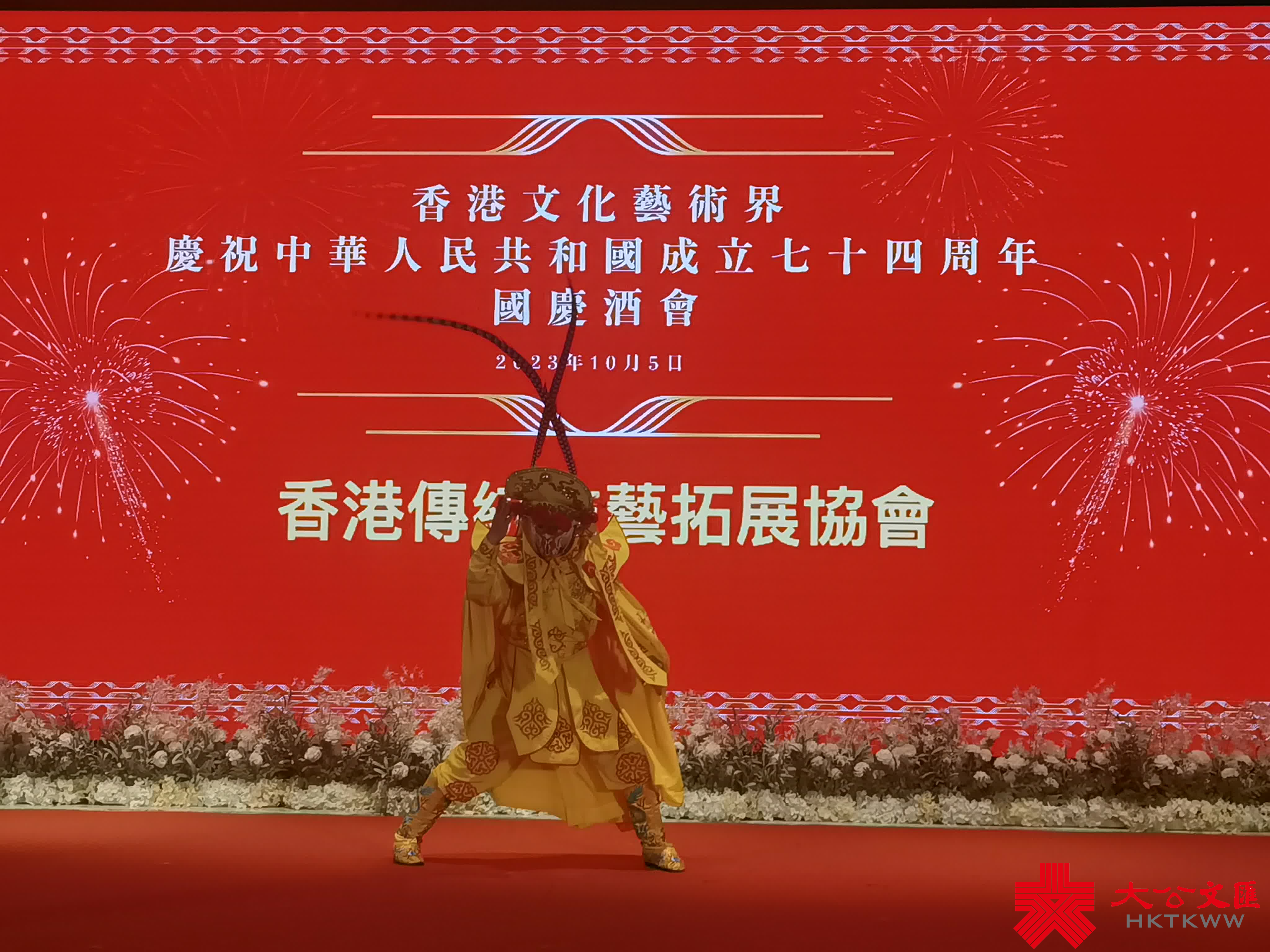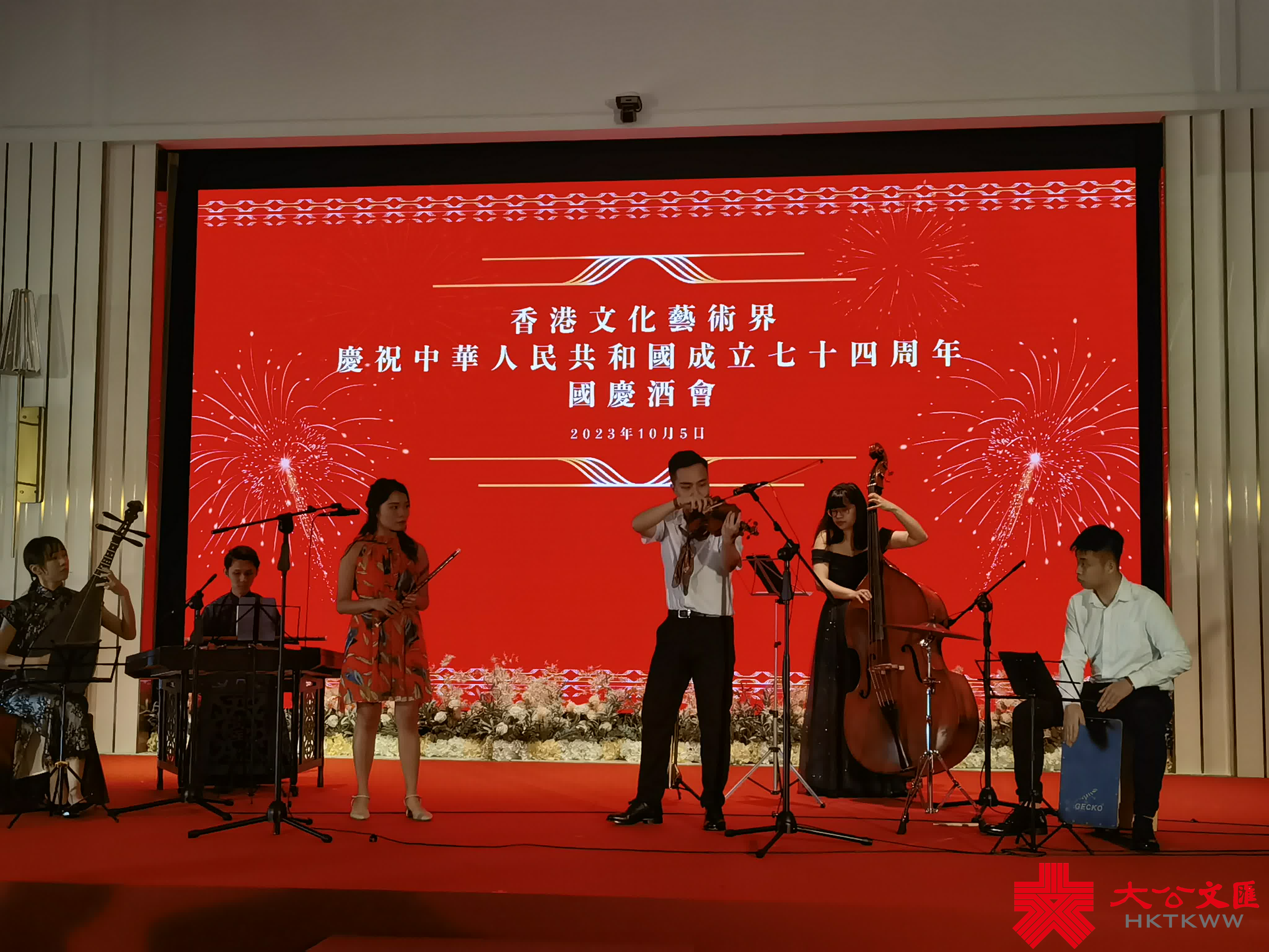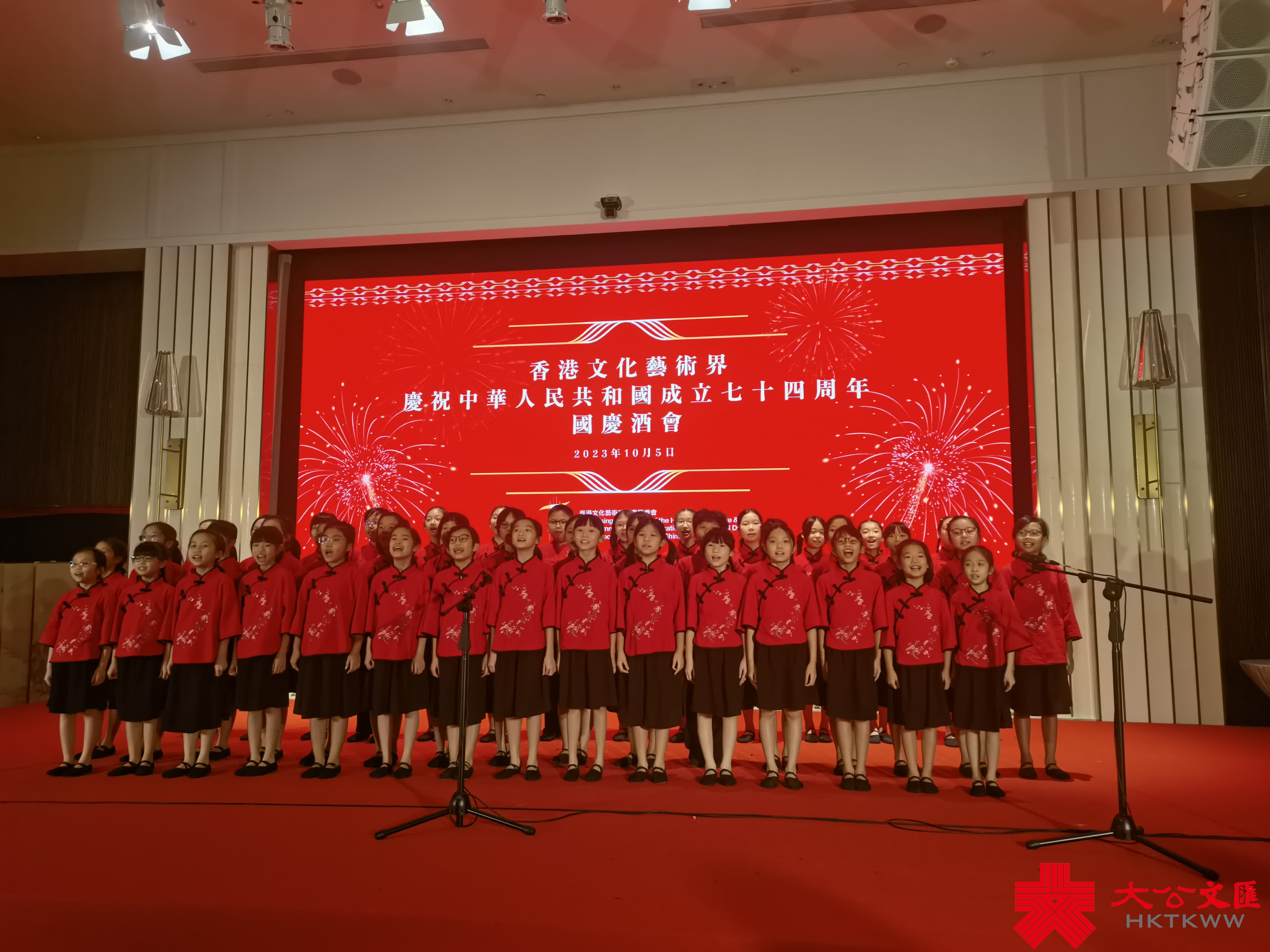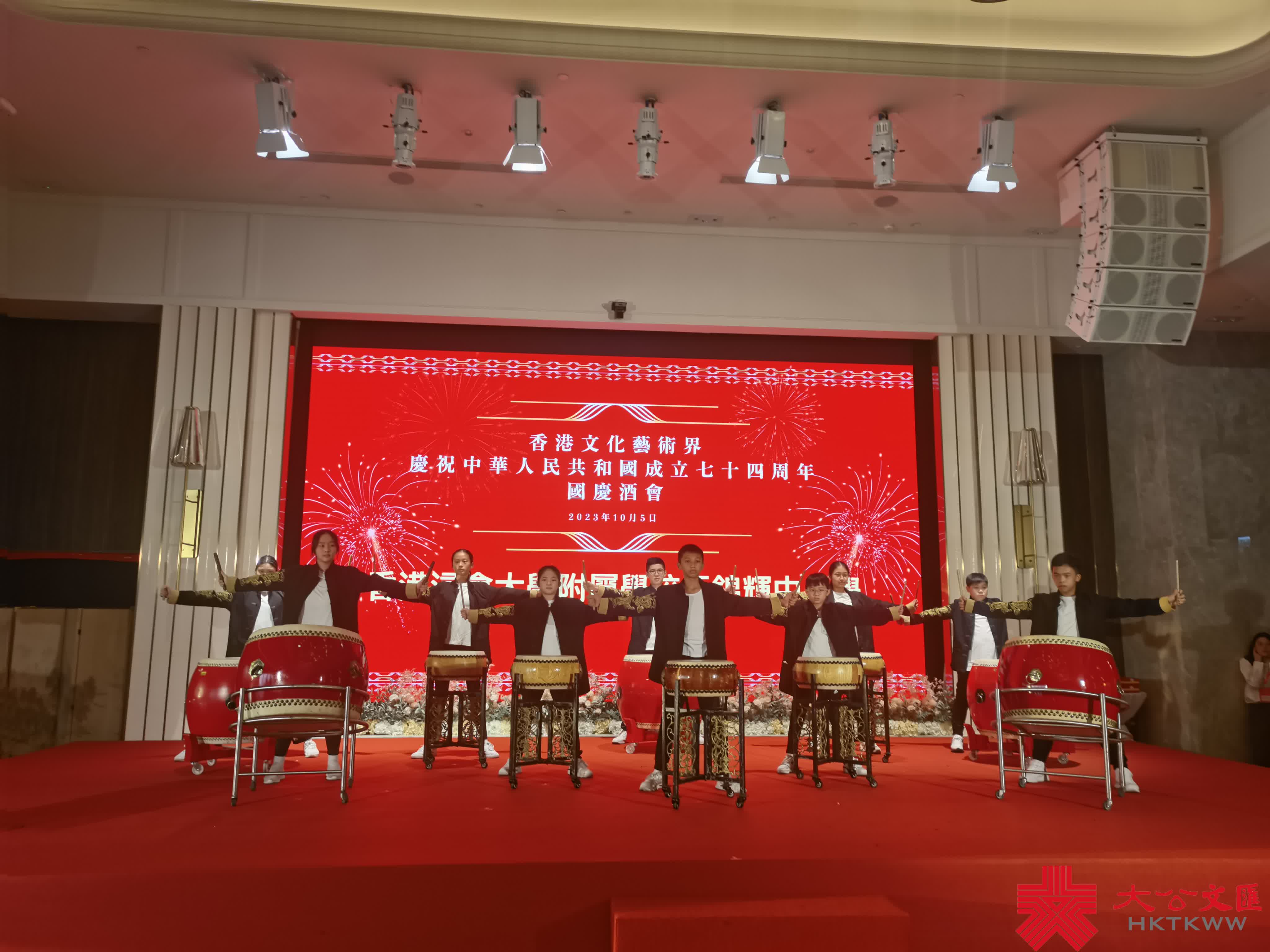 香港文化藝術界國慶酒會進行過程中舉行的文藝表演,也為現場增添熱鬧氛圍。先是「伍人粵Band」表演中西樂合奏,展示弦樂之美;香港傳統技藝拓展協會上演的變臉表演,表演者手法嫻熟,與台下觀眾互動,獲得觀眾掌聲。祝酒儀式結束之後,來自香港培道小學合唱團表演「嘆歌」,以及香港浸會大學附屬學校王錦輝中小學表演中國鼓,展示一眾孩子們的精神面貌。