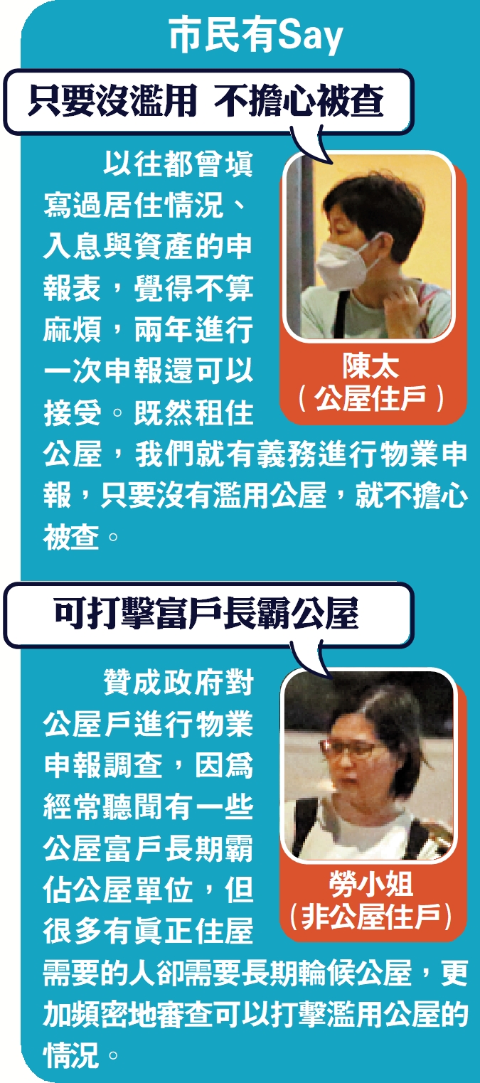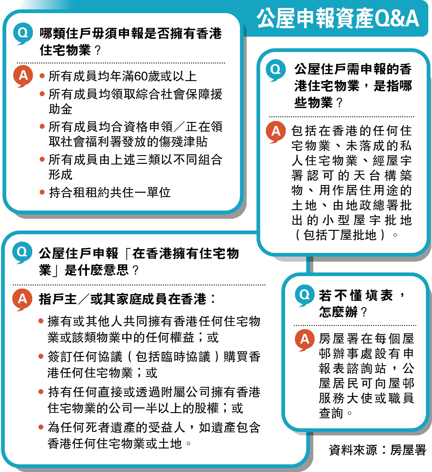 根據新措施要求,入住公屋滿2年而未滿10年的住戶,申報擁有物業只需填寫香港住宅物業;居住滿10年的住戶,則需同時申報香港與境外物業。