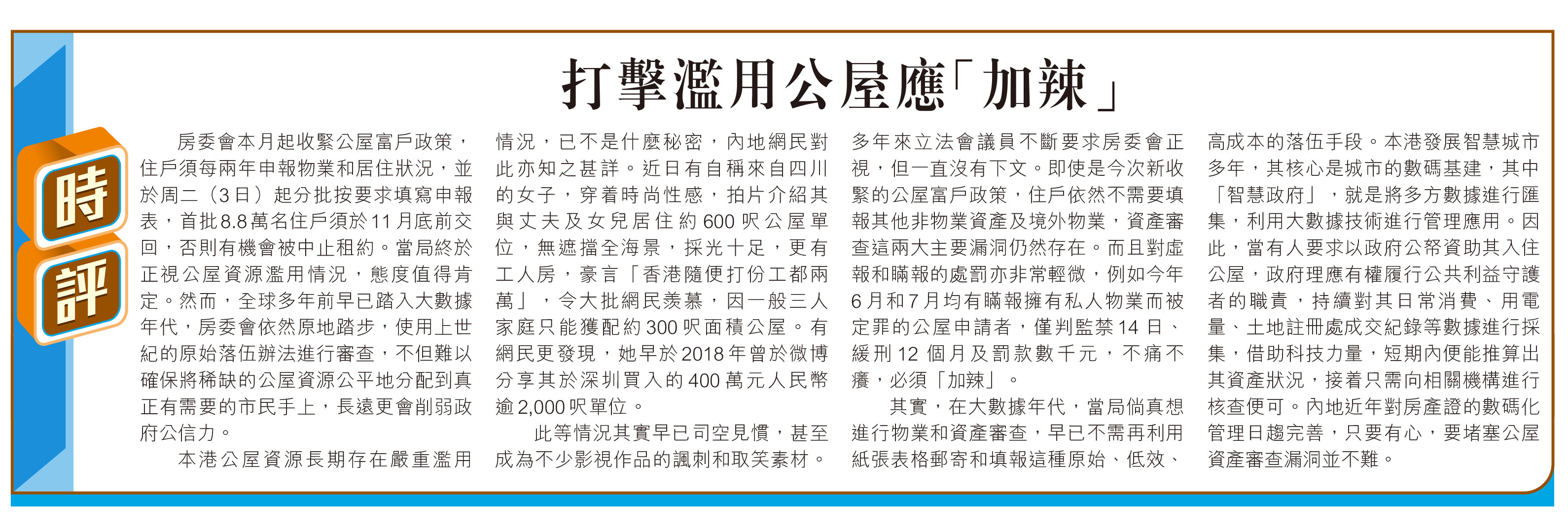 此等情況其實早已司空見慣,甚至成為不少影視作品的諷刺和取笑素材。多年來立法會議員不斷要求房委會正視,但一直沒有下文。即使是今次新收緊的公屋富戶政策,住戶依然不需要填報其他非物業資產及境外物業,資產審查這兩大主要漏洞仍然存在。而且對虛報和瞞報的處罰亦非常輕微,例如今年6月和7月均有瞞報擁有私人物業而被定罪的公屋申請者,僅判監禁14 日、緩刑12 個月及罰款數千元,不痛不癢,必須「加辣」。