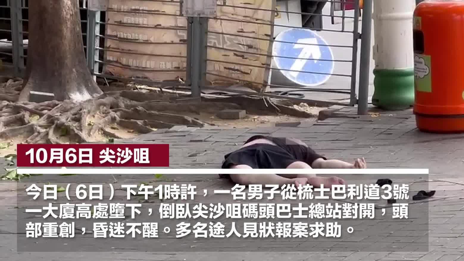 大公文匯全媒體報道,尖沙咀有人墮樓亡。事發於今日(6日)下午1時許,一名男子從梳士巴利道3號一大廈高處墮下,倒臥尖沙咀碼頭巴士總站對開,頭部重創,昏迷不醒。多名途人見狀報案求助。