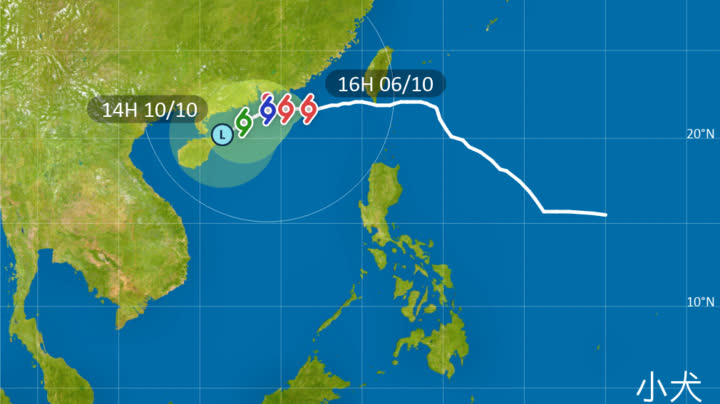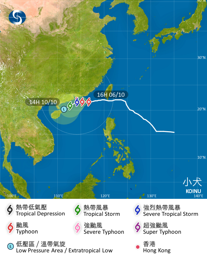 天文台表示,在下午4時,「小犬」集結在香港之東南偏東約270公里,即在北緯21.7度,東經116.7度附近,預料向西移動,時速約12公里,橫過廣東沿岸海域。「小犬」中心附近最高持續風速為每小時145公里,屬颱風級上限。