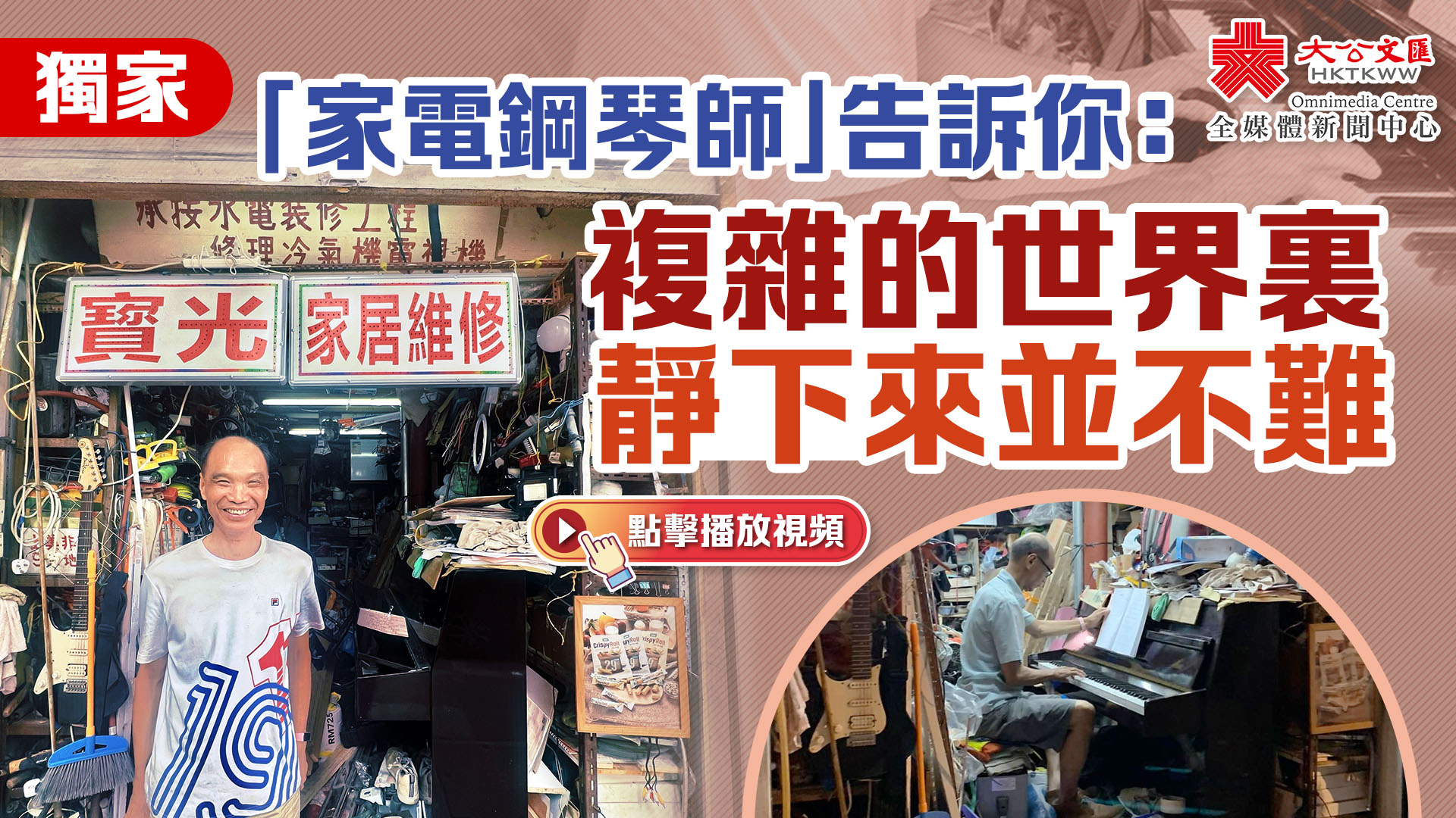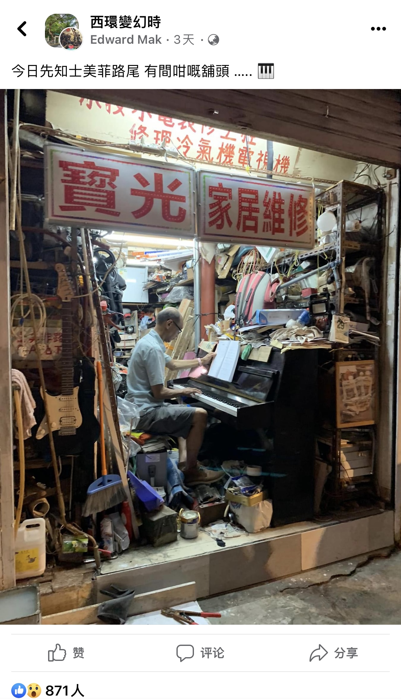 (大公文匯全媒體 記者 周傾芫)近日,從西環隱世角落傳來悠揚琴聲,在市民的耳朵間一傳十、十傳百,目光逐漸聚焦在士美菲路的某間家居維修店舖內——一名穿皮鞋的中年男子,獨自坐在一架鋼琴前,一手按着琴譜,一手彈着琴鍵,周身卻滿布灰塵和雜物,形成一個獨特的格局。網友見照紛紛感嘆:「好有型」、「好浪漫」、「一個被家居維修耽誤嘅鋼琴大師」,讓人相信高手在民間。
