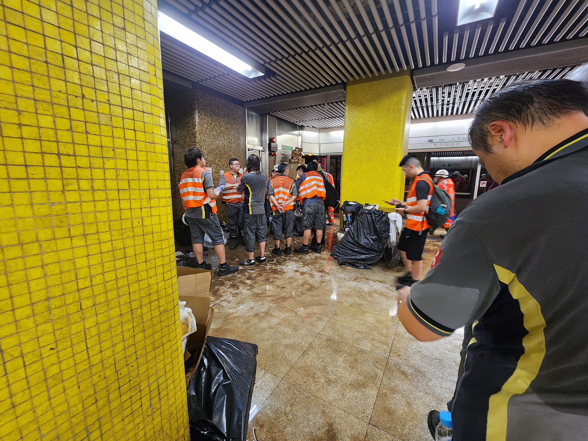 至於曾經被黃泥水浸沒頂的地庫層仍未解封,目前以白色帆布圍封。黃大仙港鐵站連接北館的出入口,暫時未見加強防範水浸措施,但在出入口附近堆放數十個沙包備用。月台層有部分扶手電梯仍在復修,需要圍封暫停使用,地面則擺放多個儲水桶。