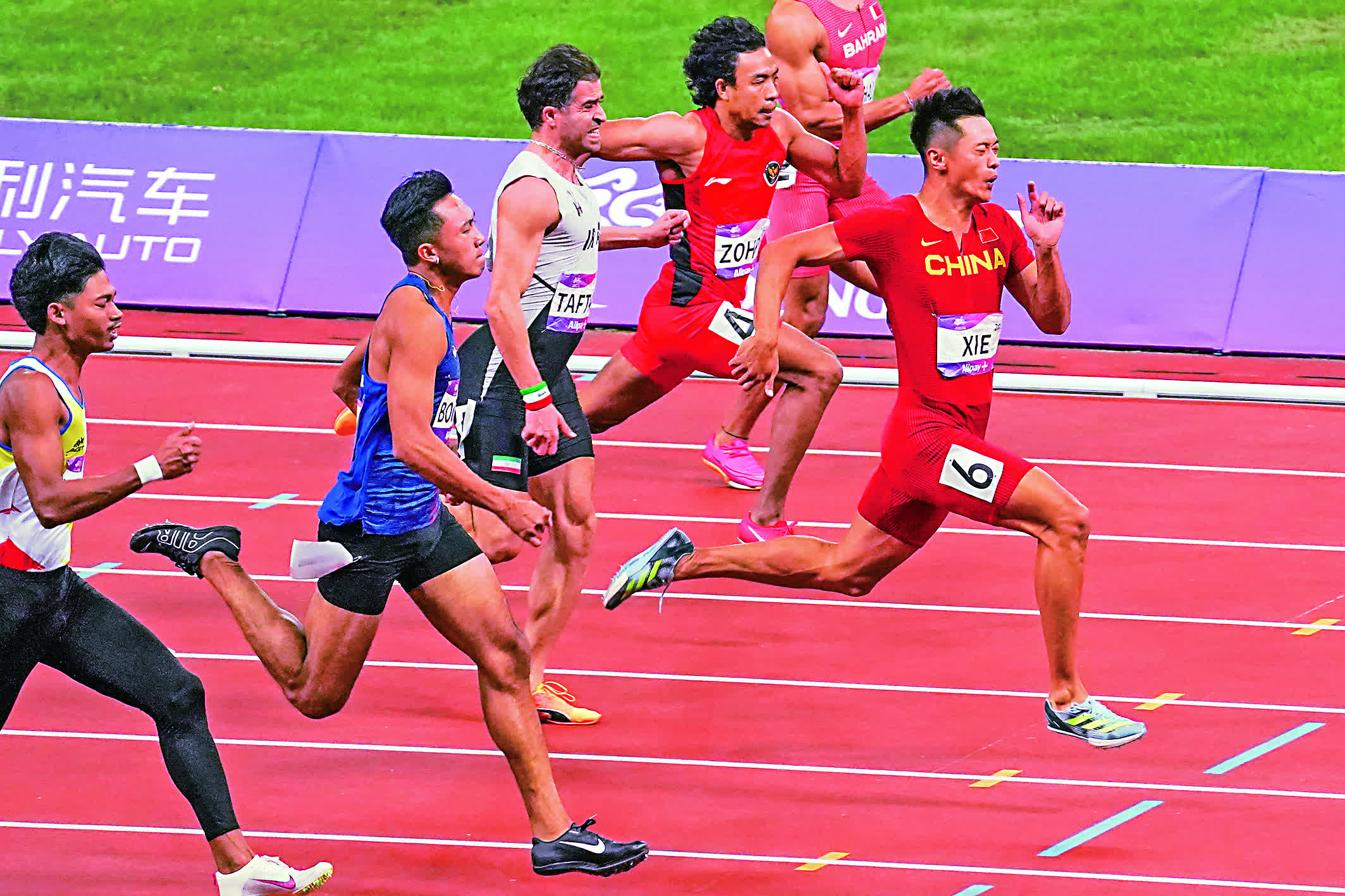 9月30日,百米飛人謝震業破10奪冠,「大蓮花」田徑場內放了謝震業專門為愛妻點播的《我們都一樣》。左圖為中國選手謝震業在比賽後慶祝,安撫激動落淚的妻子。