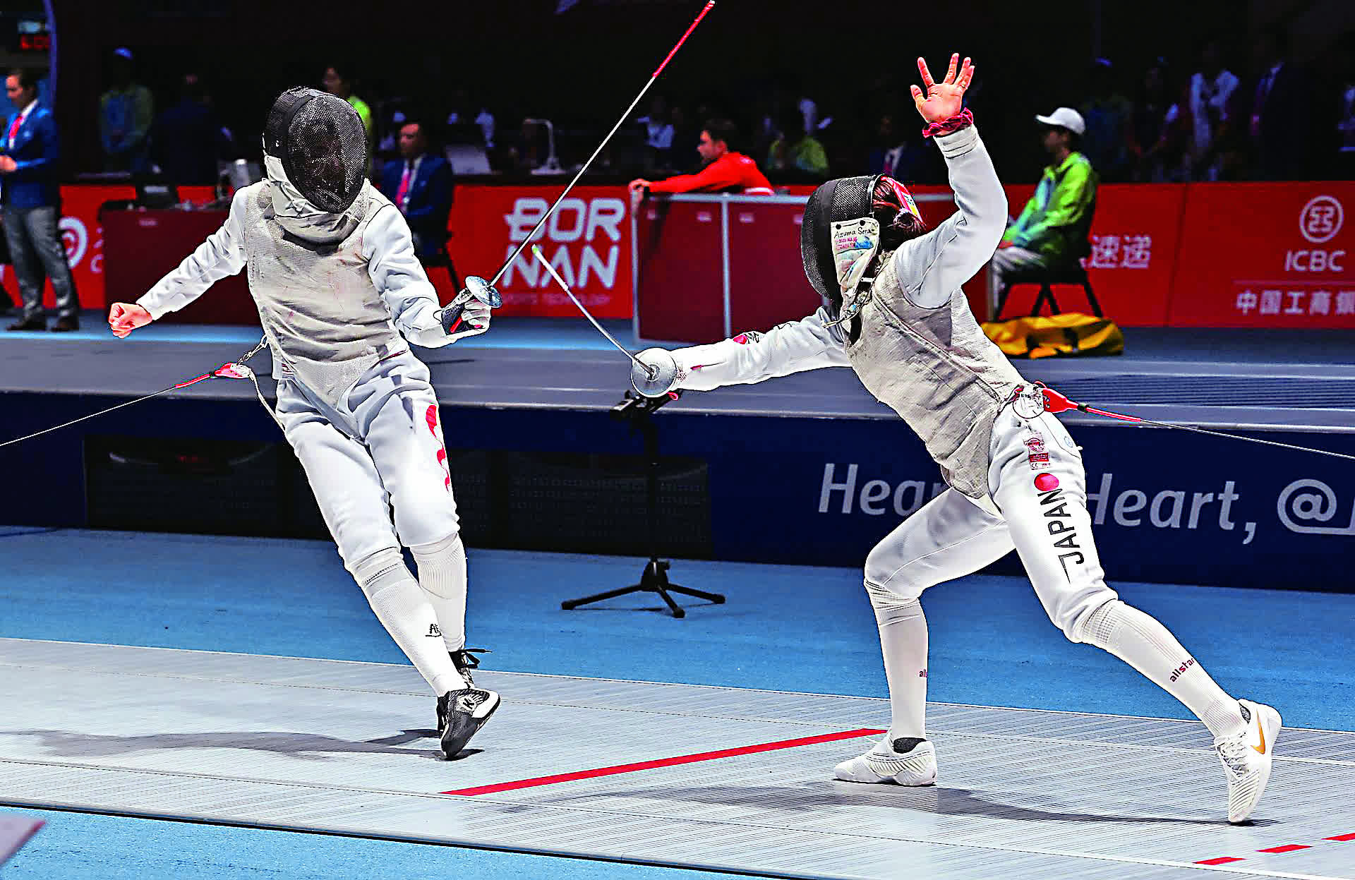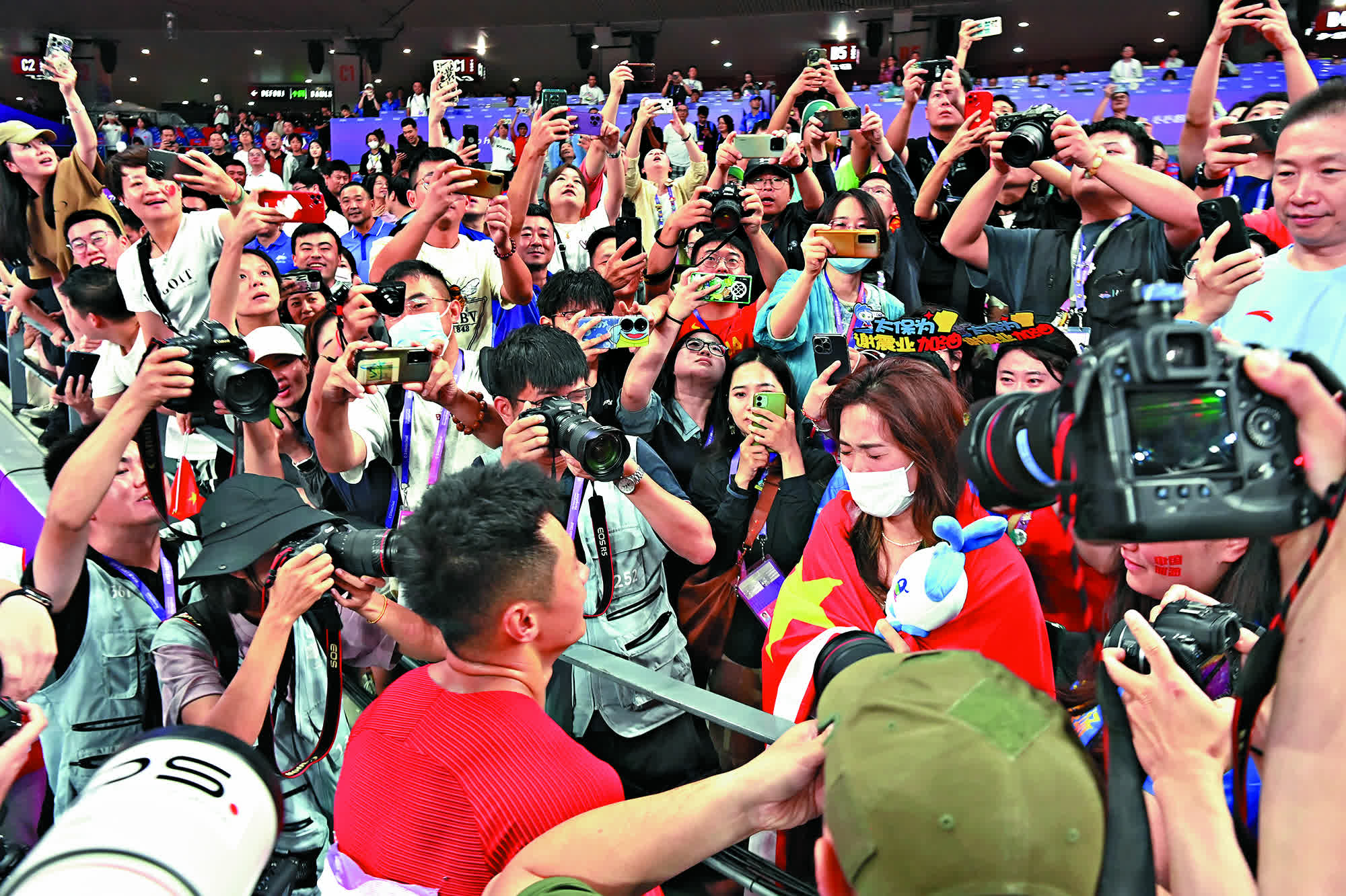 9月25日,花劍女將黃芊芊(左)奪金前館內播放的是《夜空中最亮的星》,奪冠後全場齊唱與她名字諧音的經典粵語金曲《千千闋歌》。
