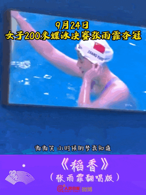 9月24日,女子200米蝶泳決賽 「蝶后」張雨霏奪冠,游泳館響起她翻唱的《稻香》。有網友表示 「配合現場奪冠的場景簡直太棒了!」