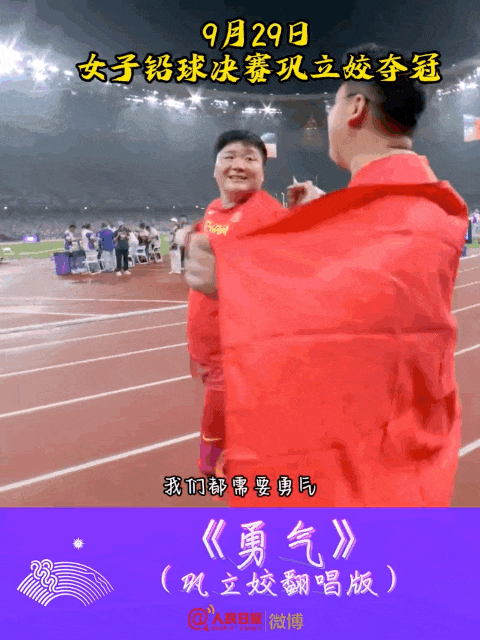 女子鉛球決賽鞏立姣奪冠,她翻唱的《勇氣》在場館內響起,這首歌也唱進了不少人的心坎裏。