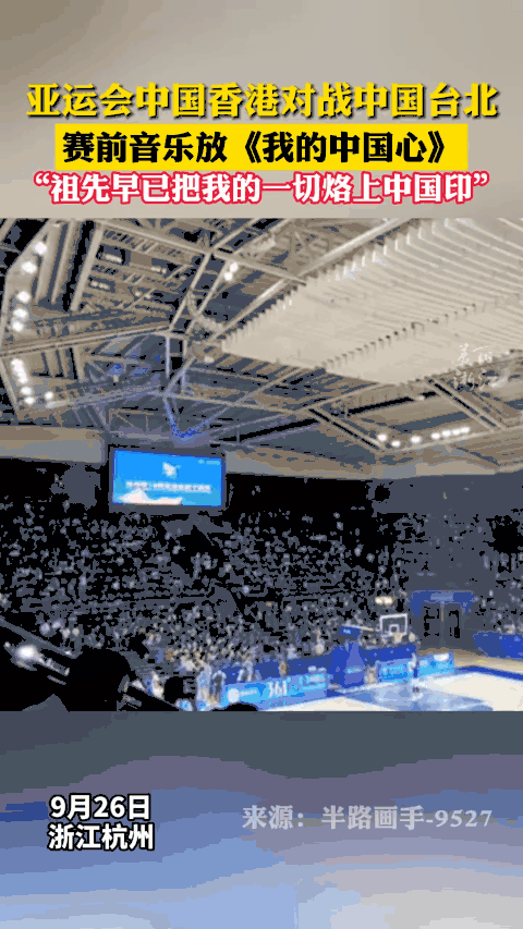 9月26日,杭州亞運會男籃小組賽中國台北VS 中國香港。賽前,現場響起《我的中國心》, 「我的祖先早已把我的一切,烙上中國印」,引得現場不少觀眾紛紛跟唱。