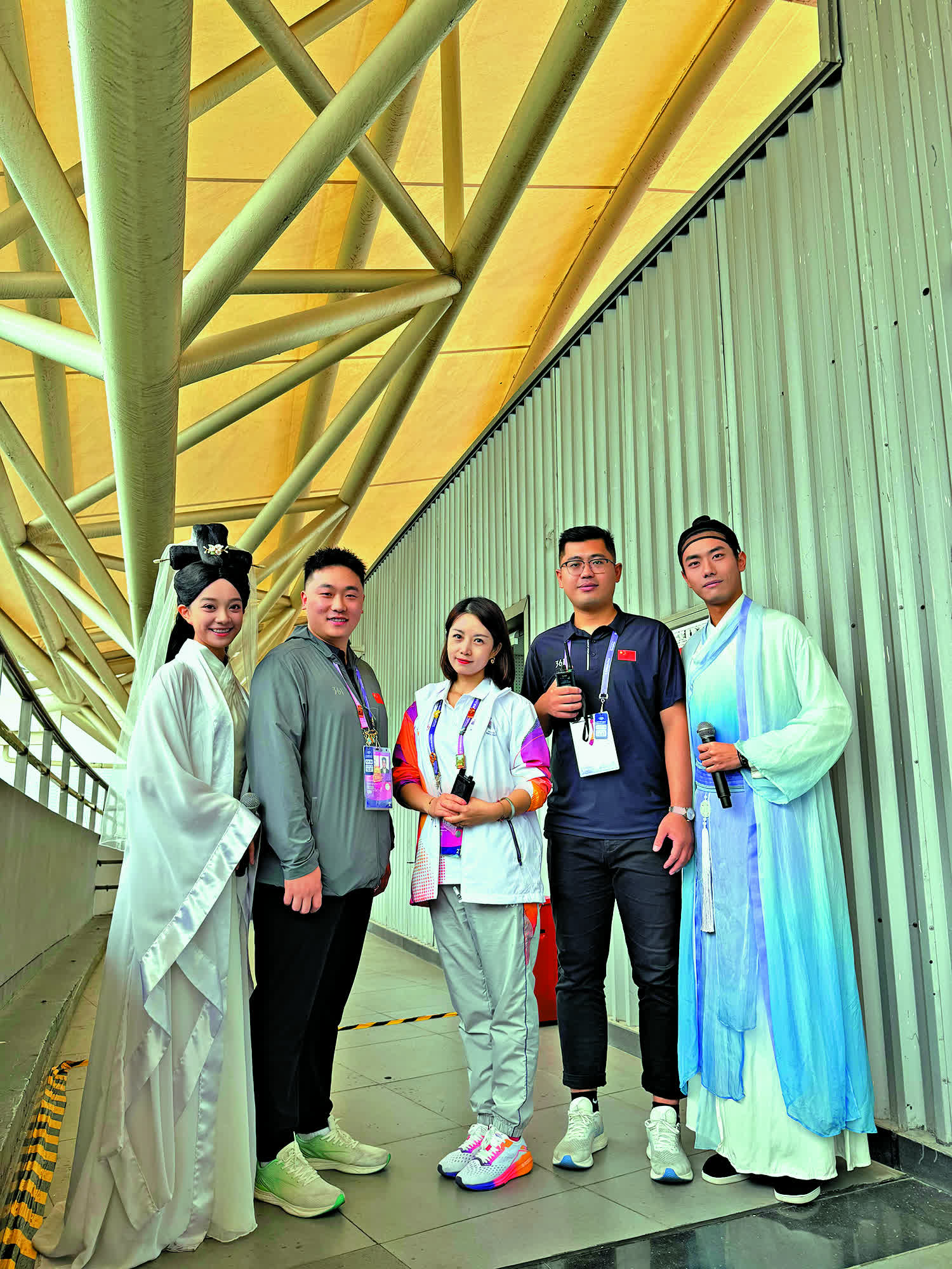 張文旭是湖北工程學院的老師,同時也是資深體育展示工作者,曾為北京冬奧等諸多大型體育比賽做過現場導演。在他看來,人們越來越看重體育比賽所能傳遞的積極精神,傳統的現場解說不斷升級,成為了全方位的現場氣氛帶動組合。「以杭州亞運會足球比賽為例,我們的體育展示團隊有近20人,包括中英文的現場播報員、音控師、大屏控制師、攝像師、導播、場地助理等等。」