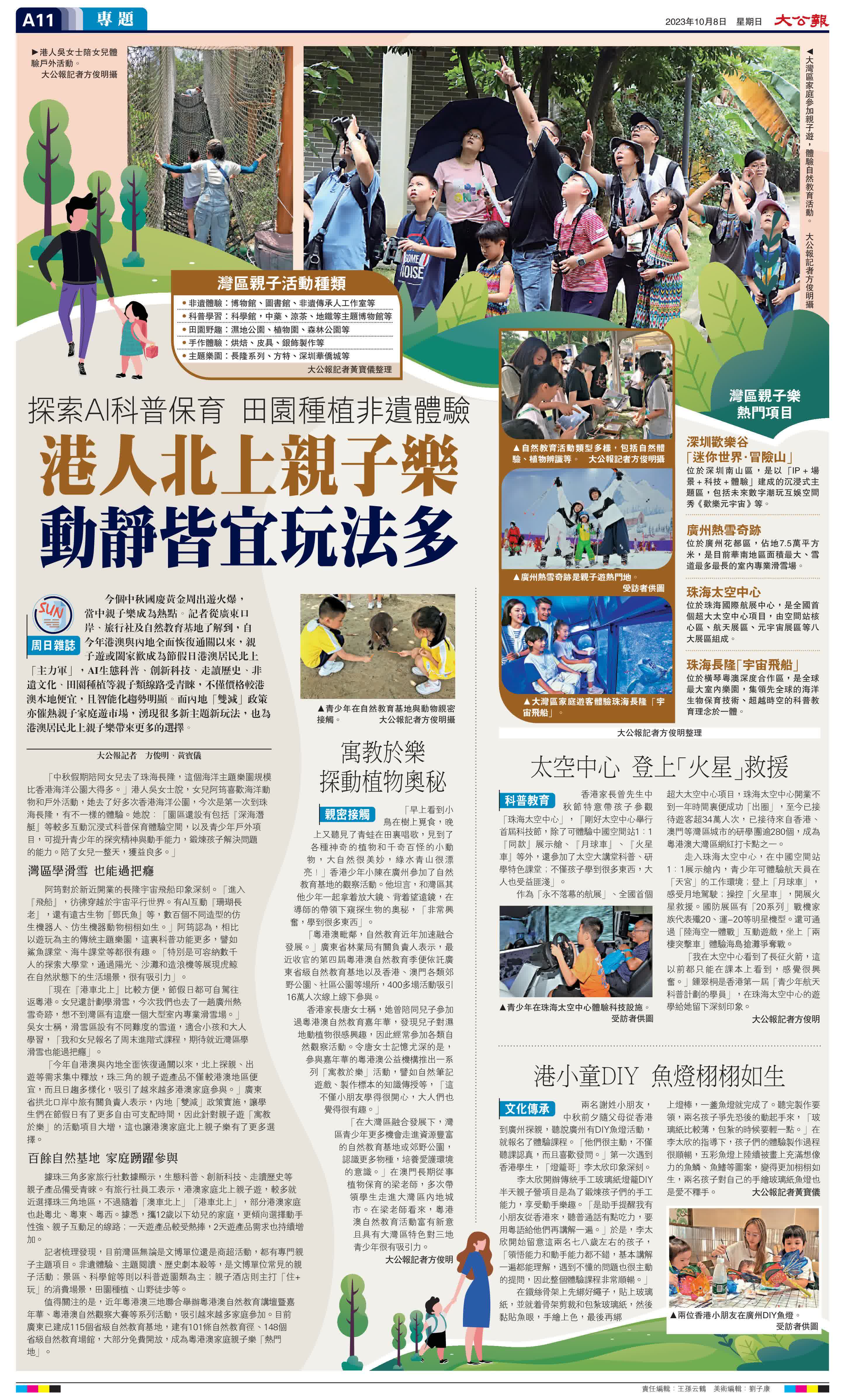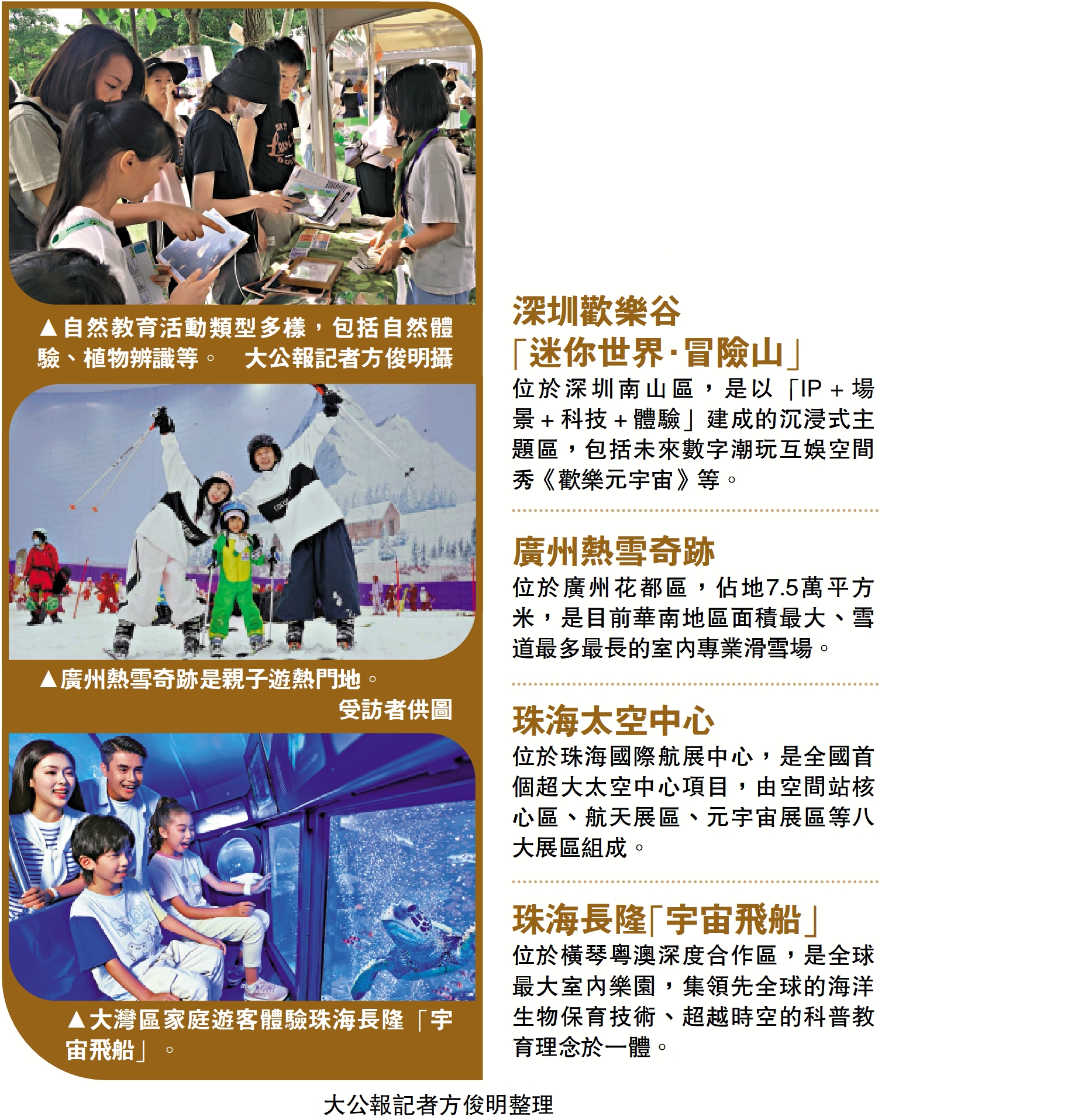 (大公報記者 黃寶儀 方俊明)今個中秋國慶黃金周出遊火爆,當中親子樂成為熱點。記者從廣東口岸、旅行社及自然教育基地了解到,自今年港澳與內地全面恢復通關以來,親子遊或闔家歡成為節假日港澳居民北上「主力軍」,AI生態科普、創新科技、走讀歷史、非遺文化、田園種植等親子類線路受青睞,不僅價格較港澳本地便宜,且智能化趨勢明顯。而內地「雙減」政策亦催熱親子家庭遊市場,湧現很多新主題新玩法,也為港澳居民北上親子樂帶來更多的選擇。