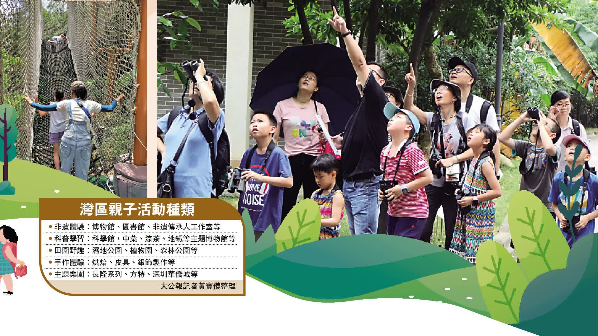 記者梳理發現,目前灣區無論是文博單位還是商超活動,都有專門親子主題項目。非遺體驗、主題閱讀、歷史劇本殺等,是文博單位常見的親子活動;景區、科學館等則以科普遊園類為主;親子酒店則主打「住+玩」的消費場景,田園種植、山野徒步等。
