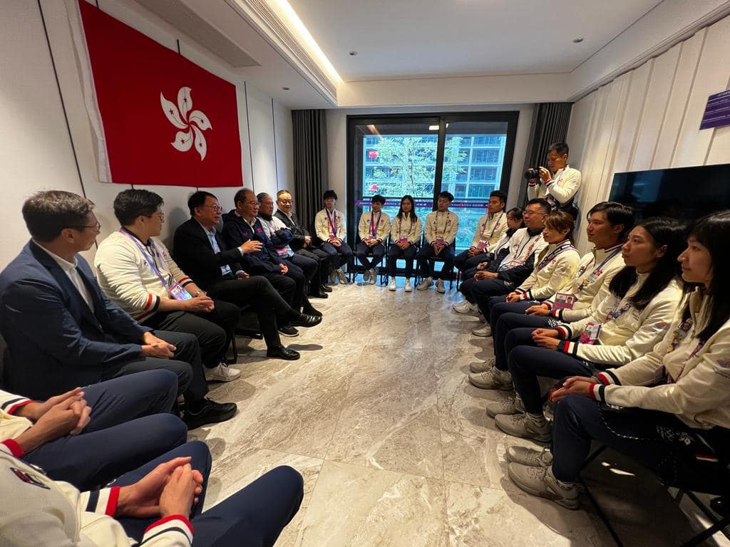 其後,陳國基聯同港協暨奧委會會長霍震霆和亞運會中國香港代表團團長霍啟剛,跟十多位香港運動員互動交流。陳國基表示,留意到在席的香港運動員中,不少都很年輕,這正反映香港體壇「長江後浪推前浪」的健康發展。