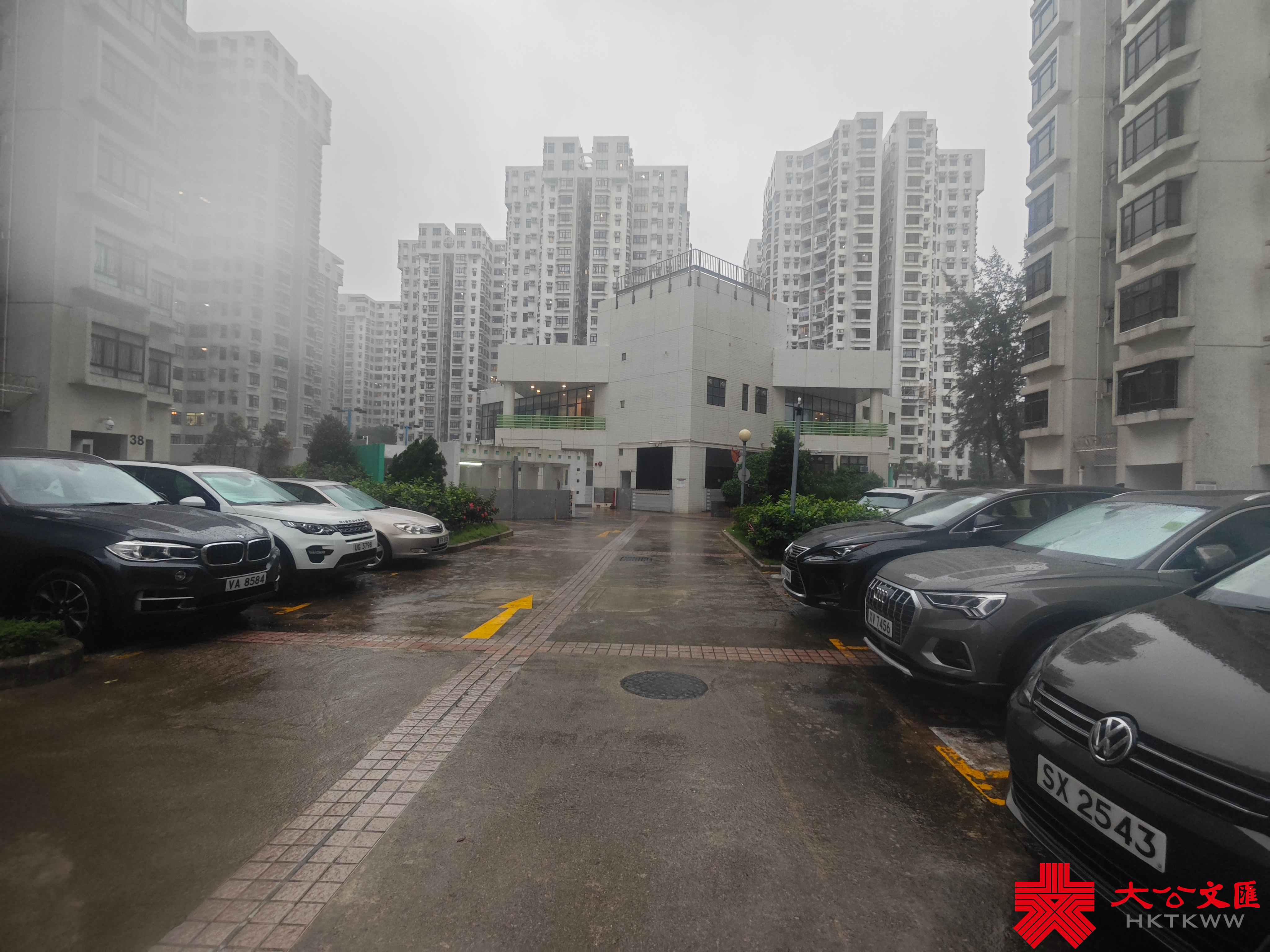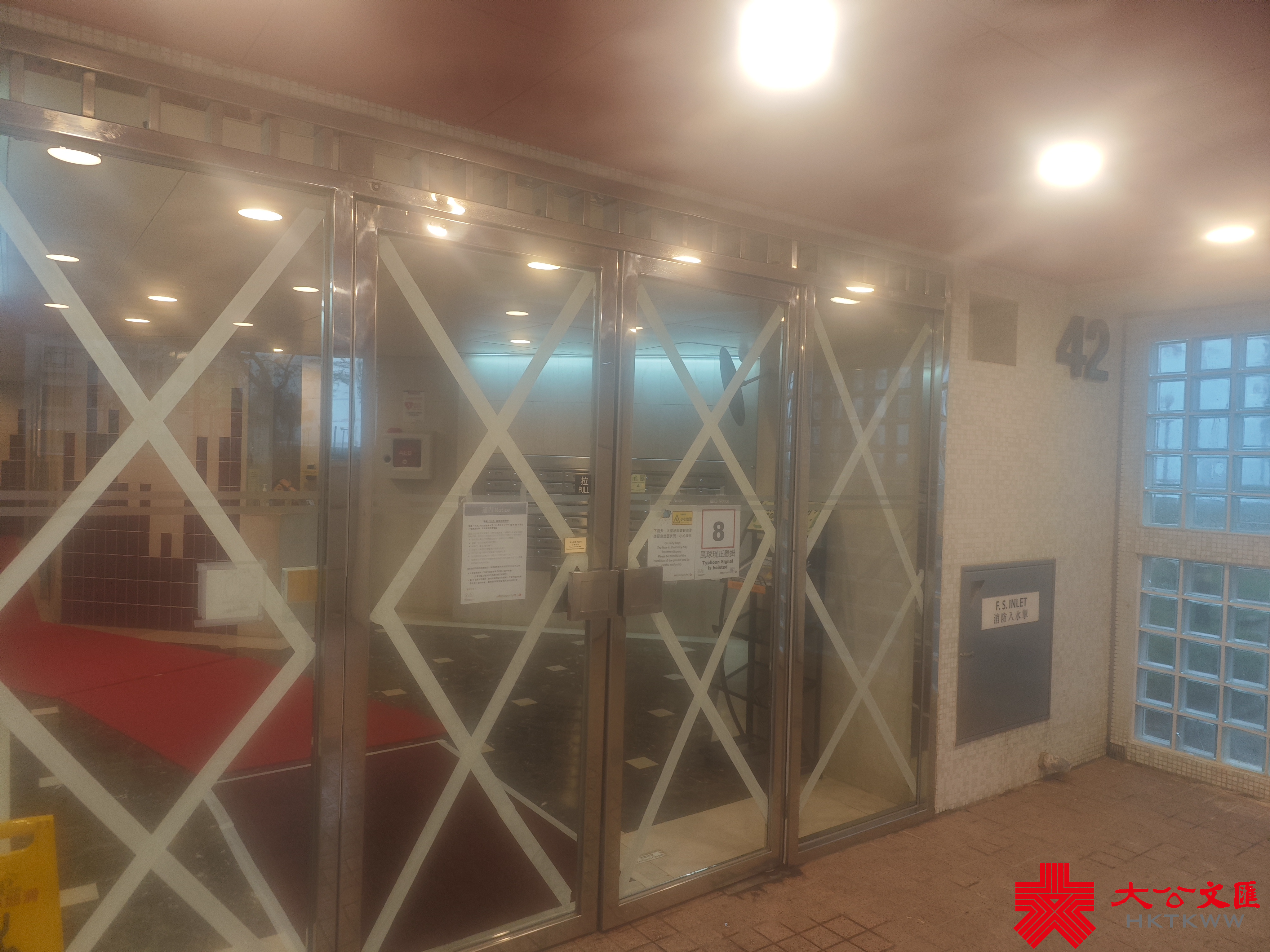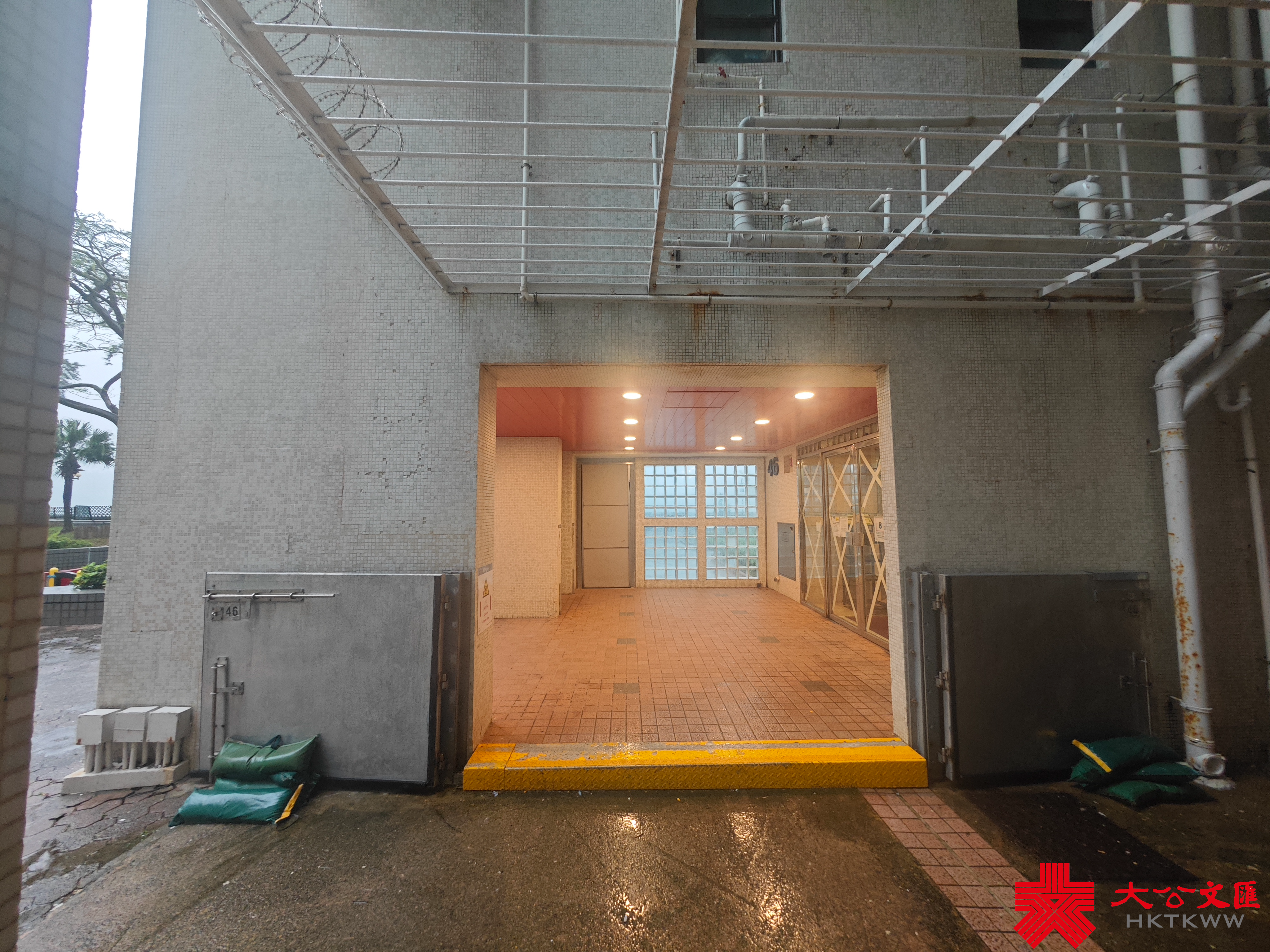記者見到,杏花邨於「小犬」襲來前已部署防風設施嚴陣以待,不少單位窗戶及大堂玻璃大門都貼上牛皮膠紙防風,管理處用防水閘關上部分大廈出入口。地下停車場早早關閉,部分車主只得把愛車停泊在地面。