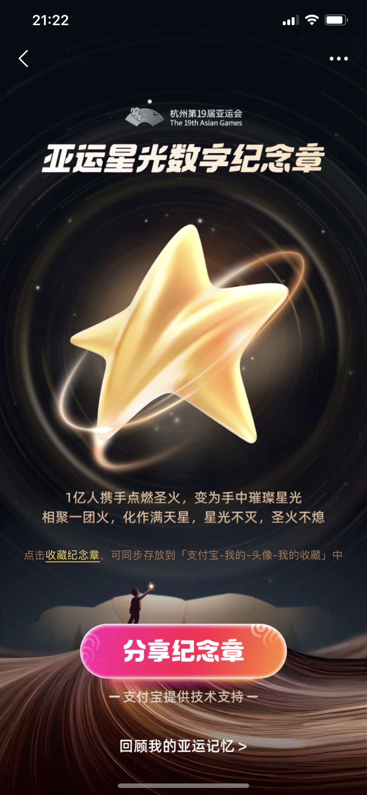 16天前,上億人攜手點燃聖火;16天后,它又變為了無數人手中的星光。星光不滅,聖火不熄,星光所及,即是美好未來。此外,值得一提的是,「數字火炬人」還將代表杭州亞運會,送給所有人一份特別的禮物——象徵着亞運精神永遠傳承的「亞運星光數字紀念章」,閉幕式後網友們在杭州亞運會官方合作夥伴支付寶搜索「亞運」即可領取。