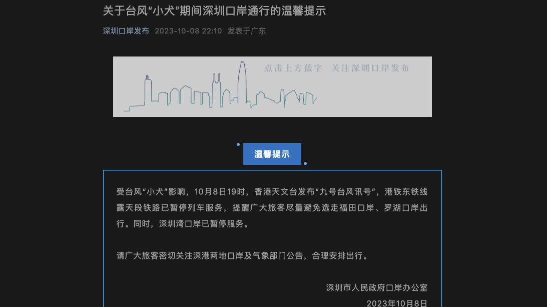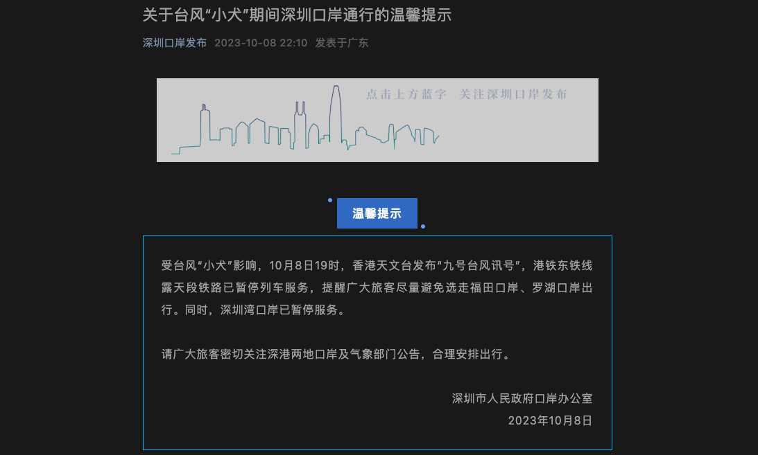 大公文匯全媒體報道,深圳市人民政府口岸辦公室今(8日)晚公布,受颱風「小犬」影響,10月8日19時,香港天文台發布「九號颱風訊號」,港鐵東鐵綫露天段鐵路已暫停列車服務,提醒廣大旅客盡量避免選走福田口岸、羅湖口岸出行。同時,深圳灣口岸已暫停服務。
