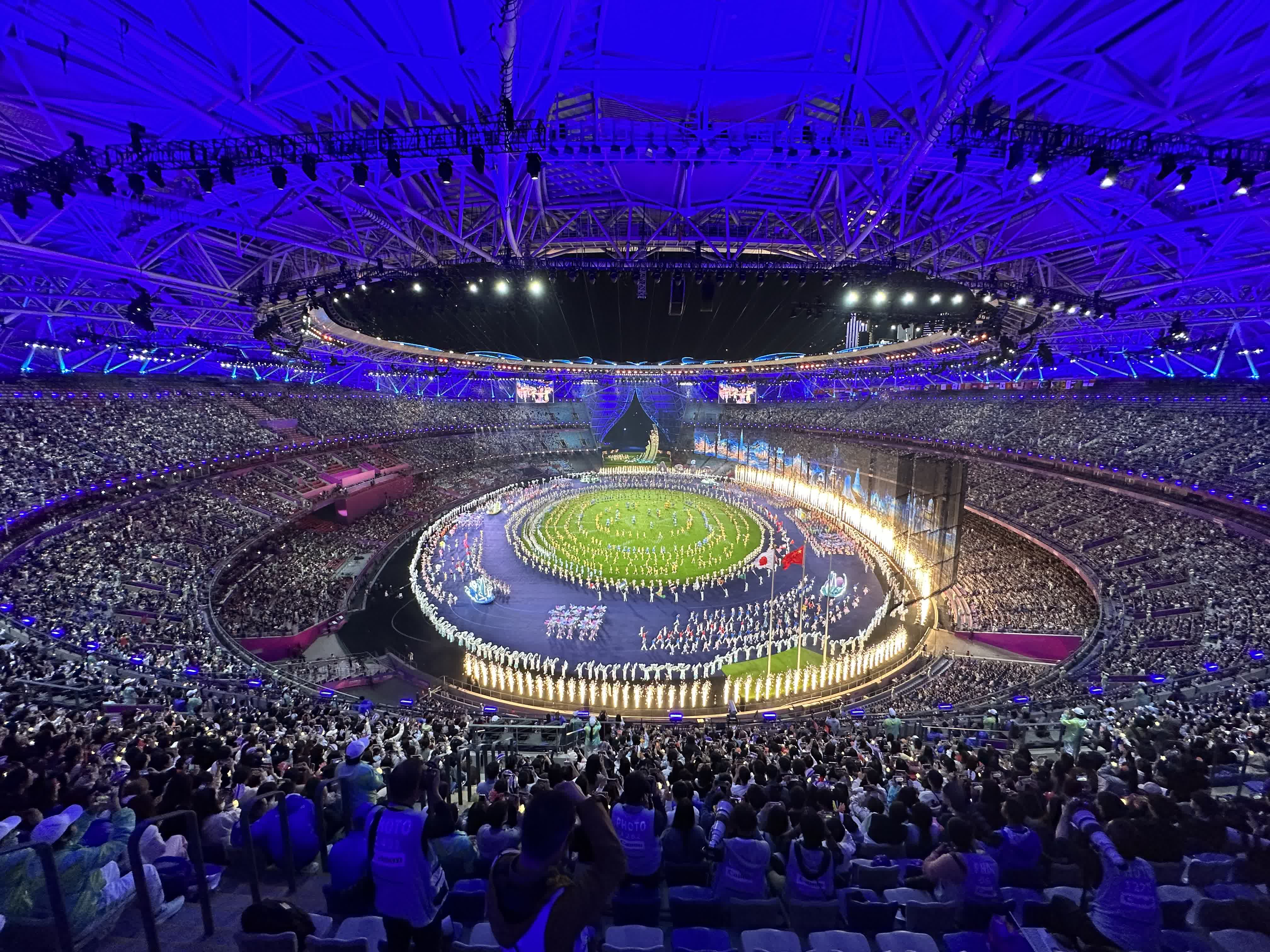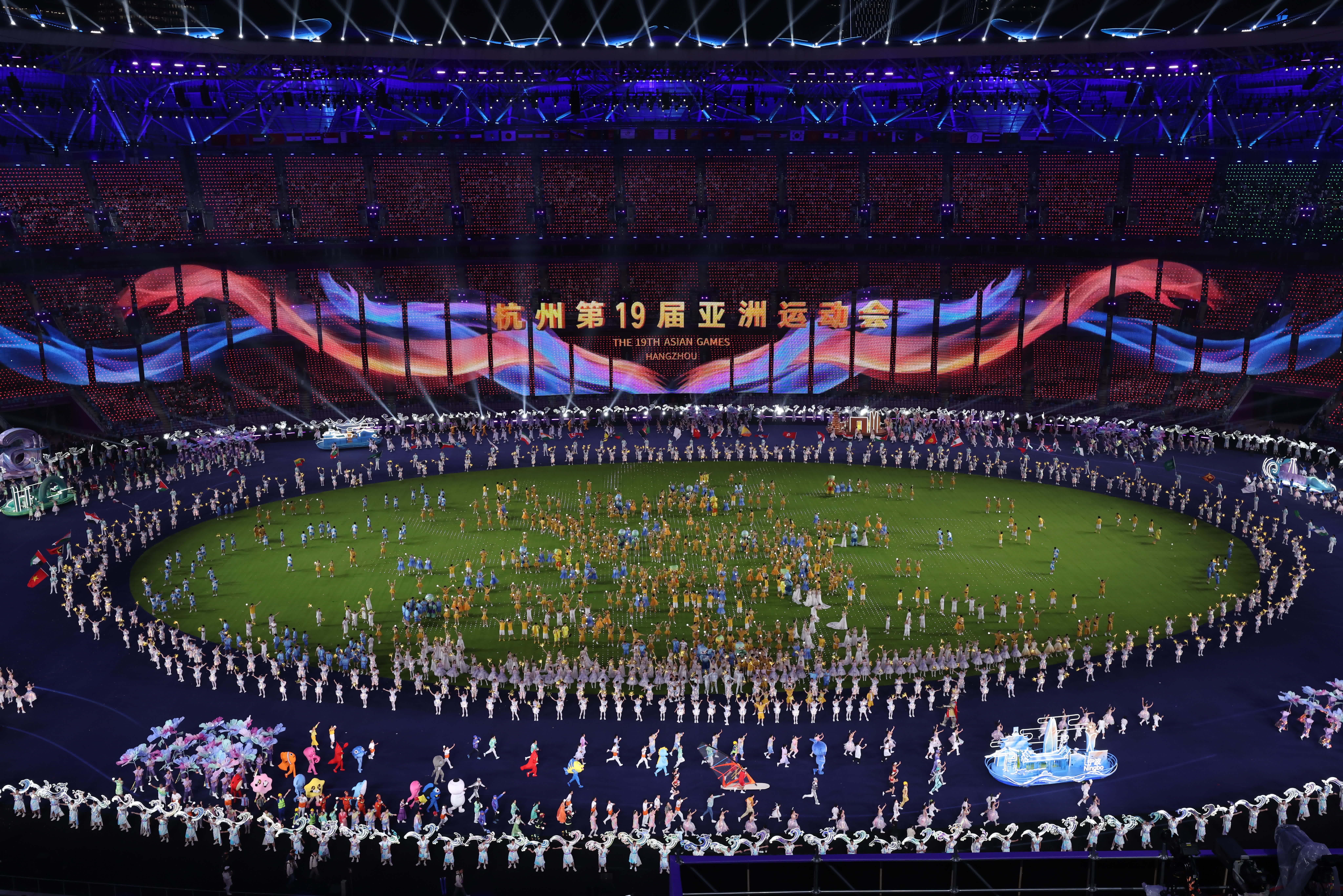 各代表團旗幟和運動員代表入場。全場觀眾以熱烈的掌聲和歡呼聲,向體育健兒們表達祝賀和敬意。短片《亞運精彩瞬間》再現亞運賽場上一幕幕充滿體育之美的場景。節目《荷桂共生輝》上演,凝結着拚搏與榮耀的「亞運記憶之花」升騰、綻放,傳達「攀花贈友」的雋永情誼與和合共生的美好願景。短片《亞運感動瞬間》將勝利與失敗、歡笑與淚水等動人畫面呈現。