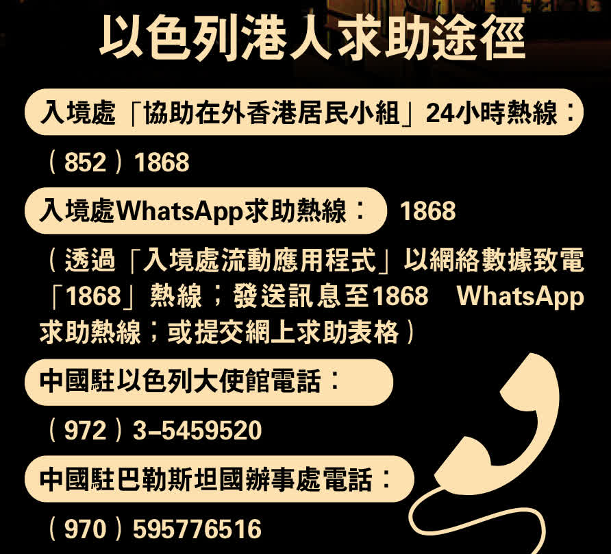 巴勒斯坦與以色列戰爭升級,局勢不斷惡化,特區政府昨日(8日)緊急提升以色列的外遊警示級別至紅色。截至昨傍晚6時,入境處共接獲17名身在當地的港人查詢,當中5人已安全乘搭航班回港。