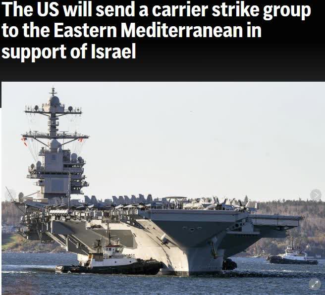 據美聯社報道,當天,美國國防部長奧斯汀發表聲明稱,他下令「傑拉爾德·R·福特」號航空母艦戰鬥群移至更靠近以色列的東地中海,包括一艘航空母艦、一艘導彈巡洋艦和四艘導彈驅逐艦,以展示武力,準備應對任何情況,這些情況包括阻止更多武器送達巴勒斯坦伊斯蘭抵抗運動(哈馬斯)以及進行監視。