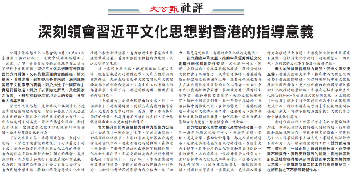 全國宣傳思想文化工作會議10月7日至8日在京召開。與以往相比,這次會議的名稱增加了「文化」二字。會議最重要的成果就是首次提出了習近平文化思想。習近平文化思想既有宏觀層面的方向引領,又有具體層面的實踐路徑,博大精深,明體達用。對於香港各界來說,深刻理解習近平文化思想的要義,對於推進「一國兩制」實踐行穩致遠,對於「以香港之所長、貢獻國家之所需」,對於推動香港實現更大的發展,具有重大指導意義。