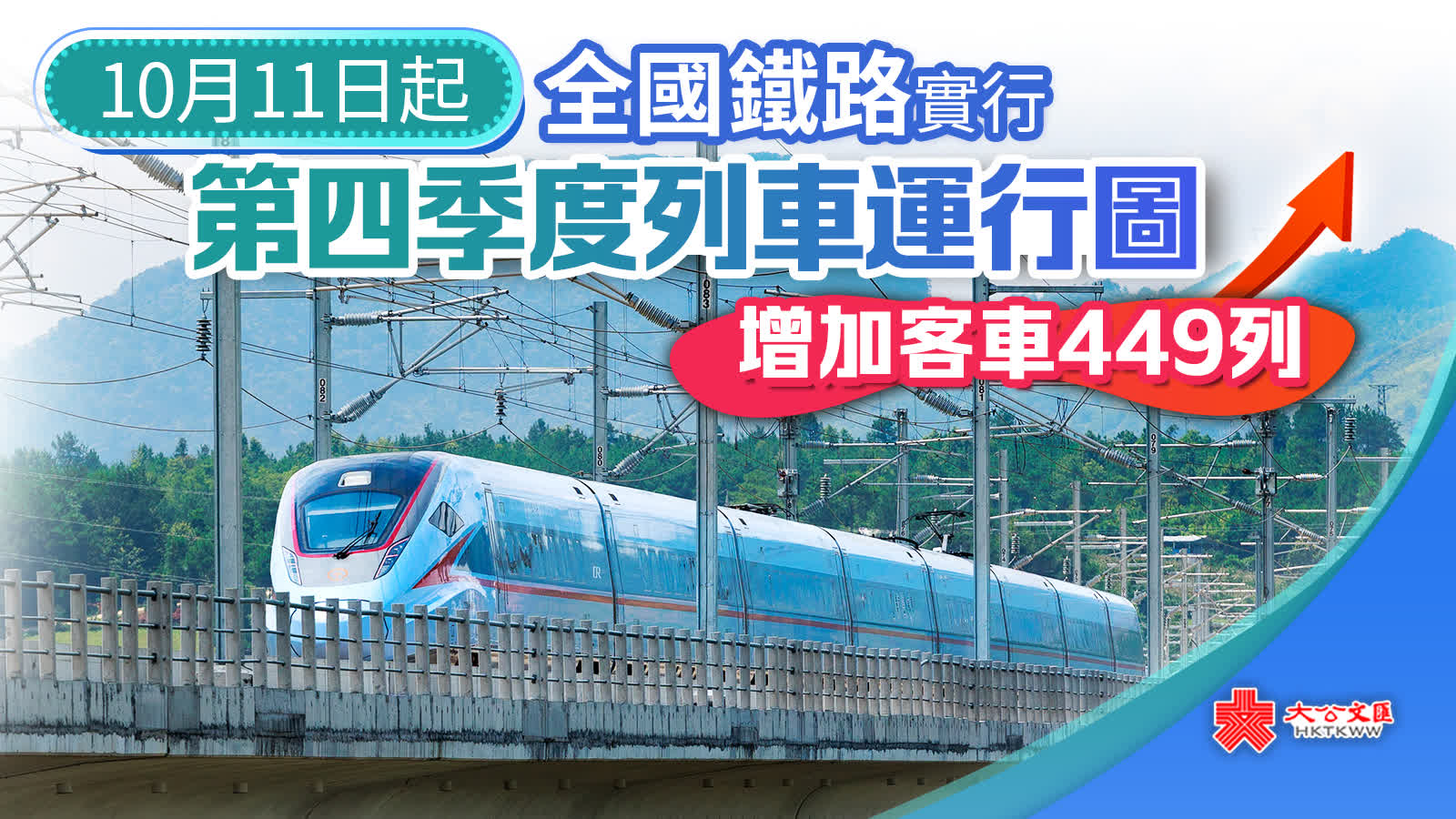 據央視網援引據中國國家鐵路集團消息,10月11日零時起,全國鐵路將實行第四季度列車運行圖。調圖後,全國鐵路安排旅客列車11075列,較現圖增加449列;開行貨物列車22224列,較現圖增加42列,鐵路客貨運輸能力進一步提升,為更好服務經濟社會發展提供有力運輸保障。