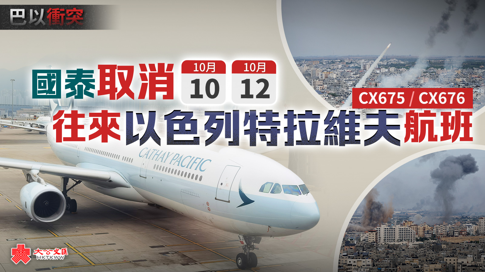 大公文匯全媒體報道,巴以衝突持續,國泰航空宣布因應以色列的局勢發展,將取消於10月10日(今日)及10月12日由香港飛往特拉維夫的CX675航班,以及由特拉維夫飛往香港的CX676航班。